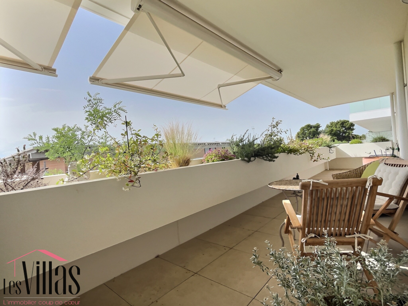La grande terrasse est équipée de stores bannes, elle vous permettra de profiter de la vue dégagée tout au long de l'année.