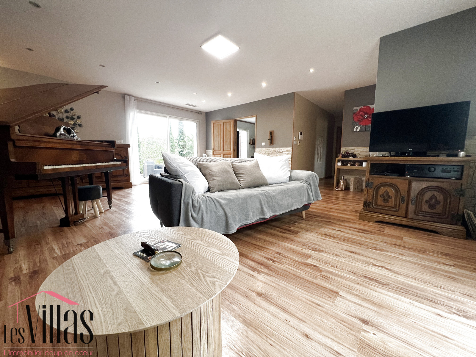 La belle pièce de vie traversante est très lumineuse et donne sur la terrasse, vue sur la nature environnante.