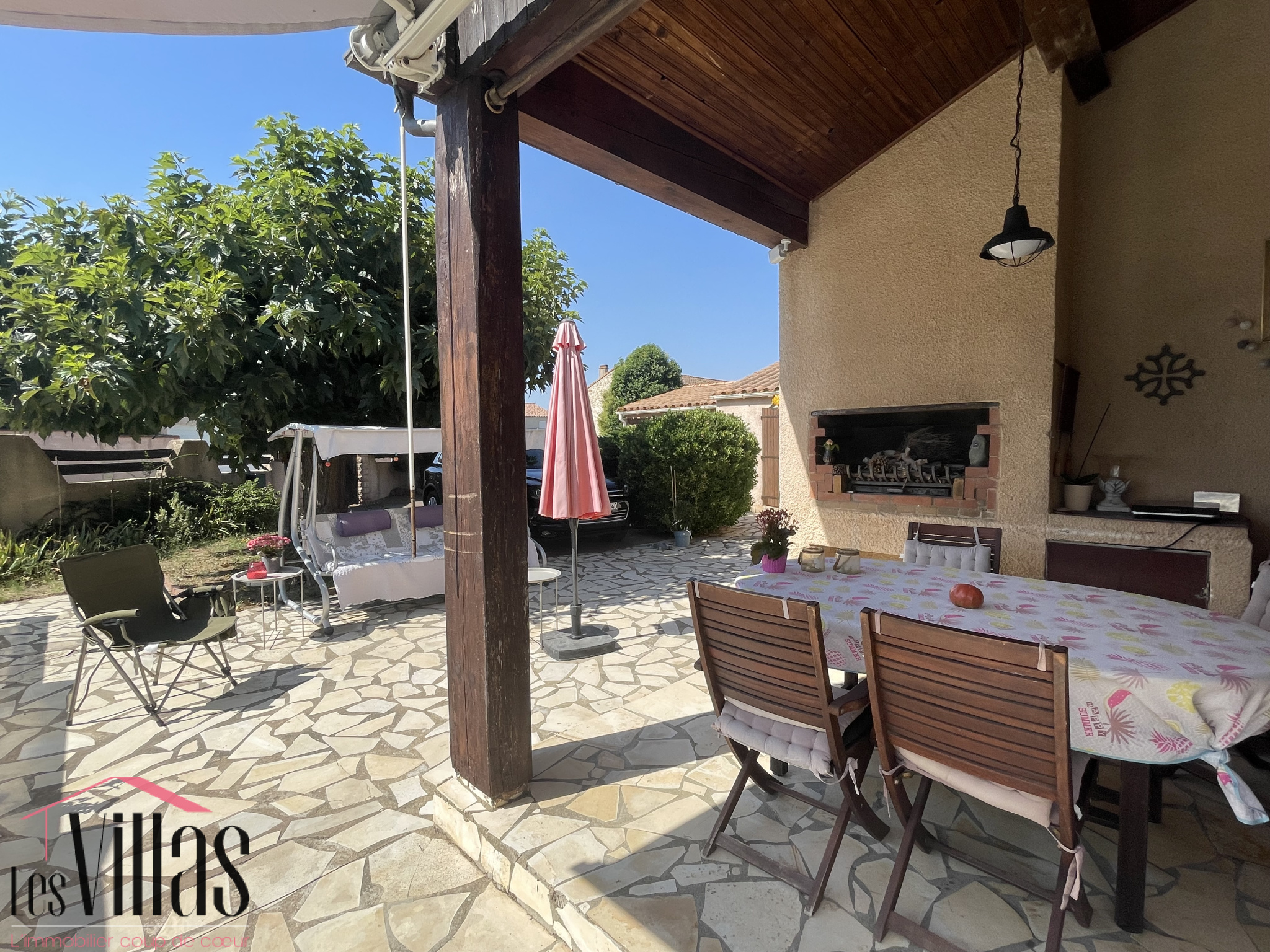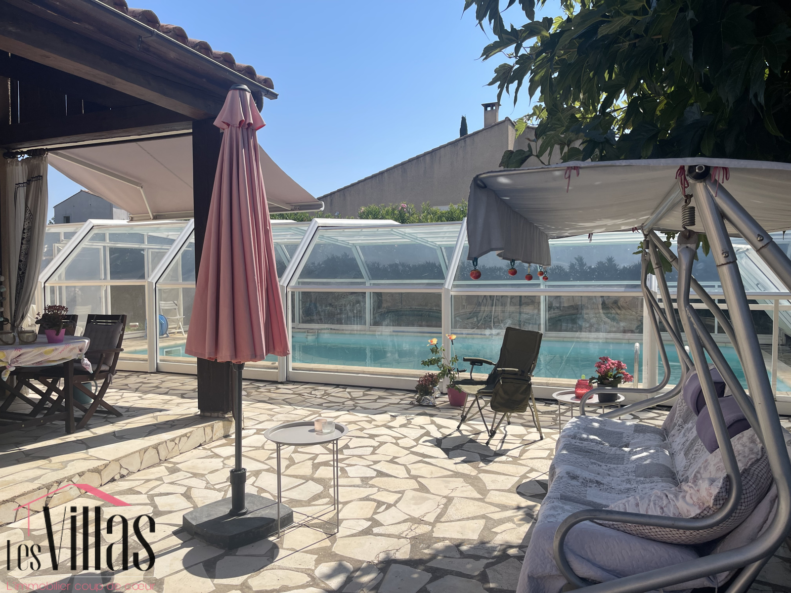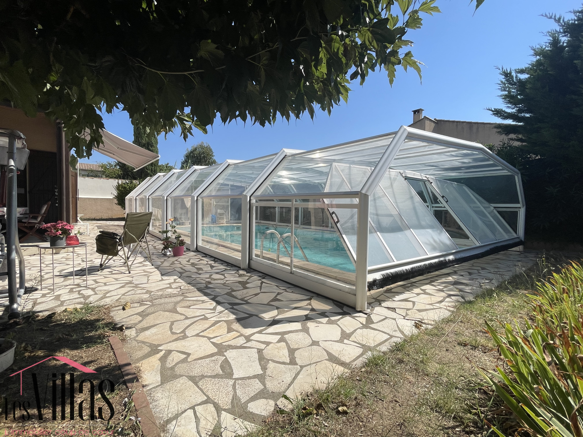 À l’extérieur, une grande piscine sécurisée avec abri de 10x5m sera idéale pour prolonger la baignade du printemps à l’automne. Les terrasses offrent plusieurs ambiances pour déjeuner, se reposer ou recevoir, tandis que le terrain permet de stationner aisément plusieurs véhicules.