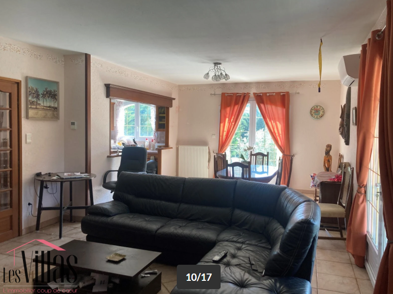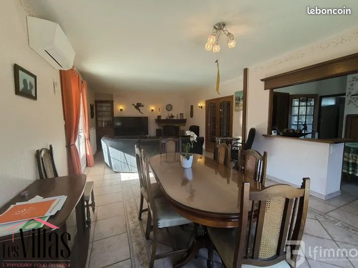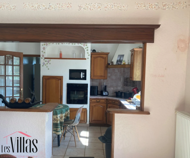 La villa se compose d'un séjour de plus de 37 m2 avec insert donnant sur la cuisine toute équipée et une arrière cuisine où se trouve une pompe à chaleur récemment installée.