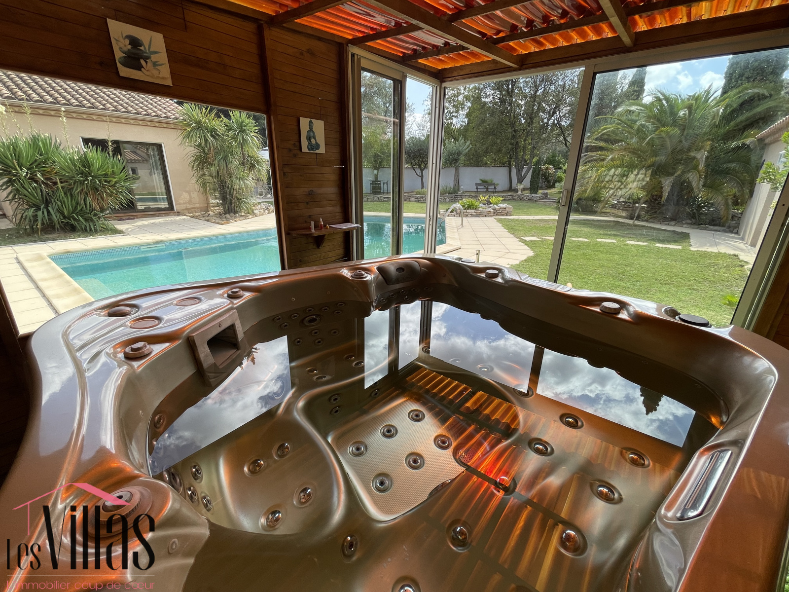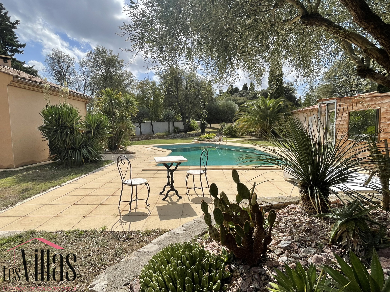 Le terrain entièrement clos, sans vis à vis, d'une surface de plus de 3000m2 propose un jardin arboré d'espèces méditerranéennes sans entretien, une belle piscine 5x11, une cuisine d'été avec barbecue, un espace bien être avec son jacuzzi et plusieurs terrasses.