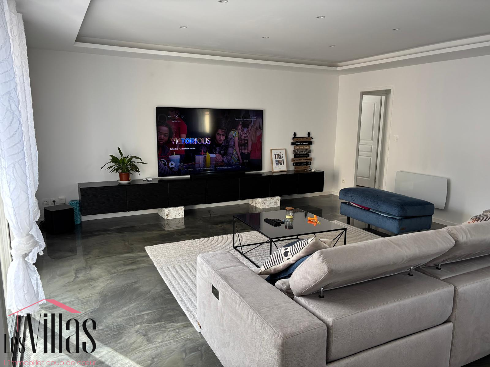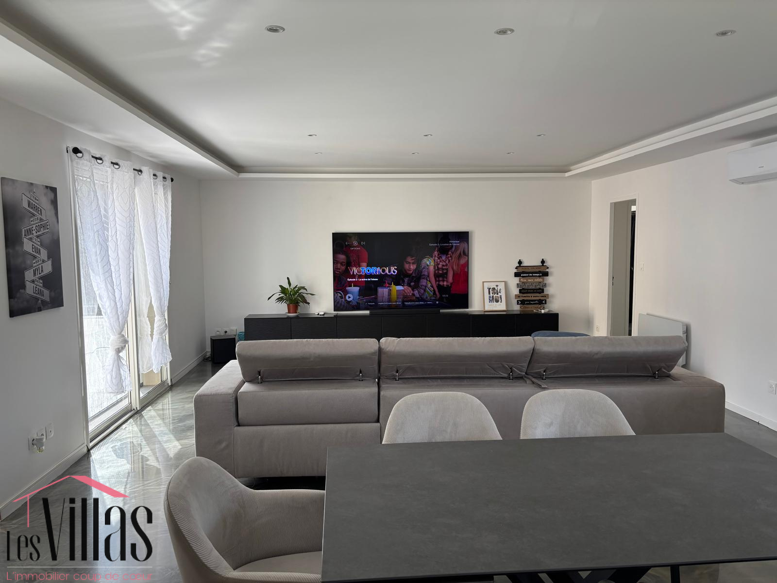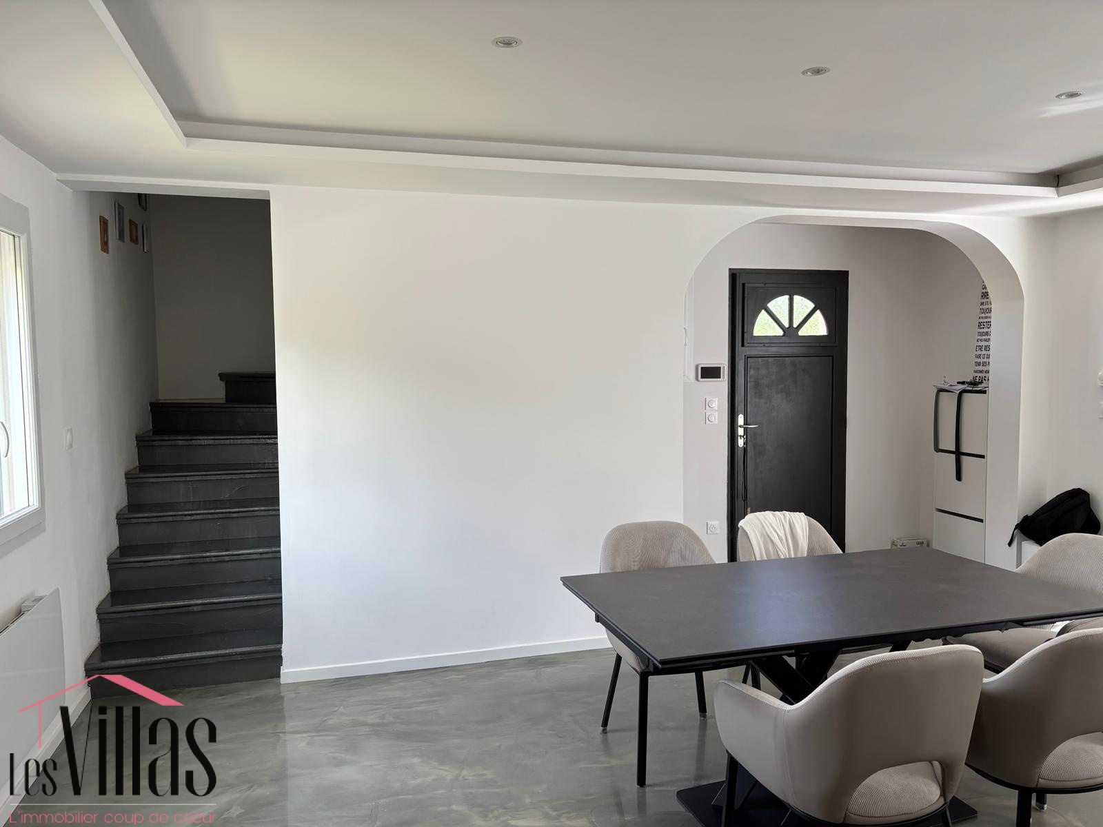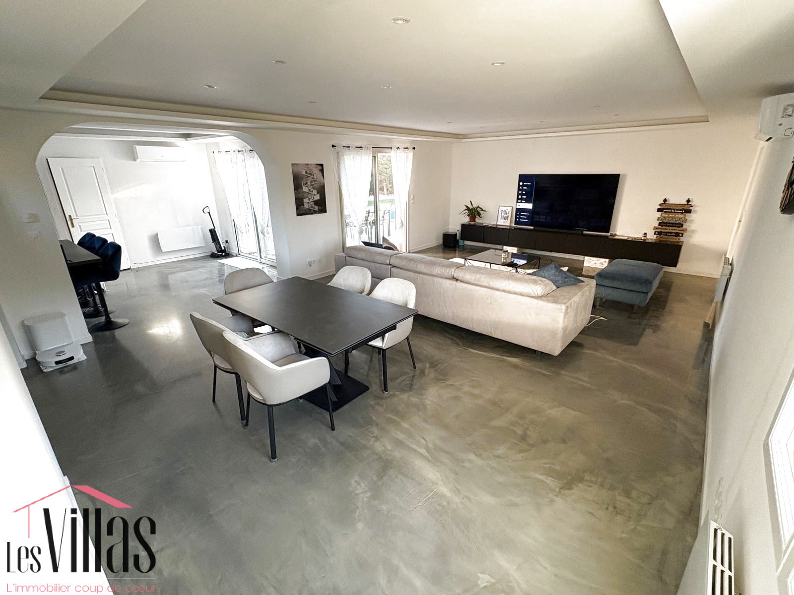 Un grand salon / salle à manger lumineux de 45 m2 climatisé ouvert sur la cuisine moderne toute équipée. Au sol une résine dans les tons de beige doré, éclairage en plafond qui agrémente parfaitement l'harmonie de la pièce de vie, donnant accès à la terrasse face à la piscine.