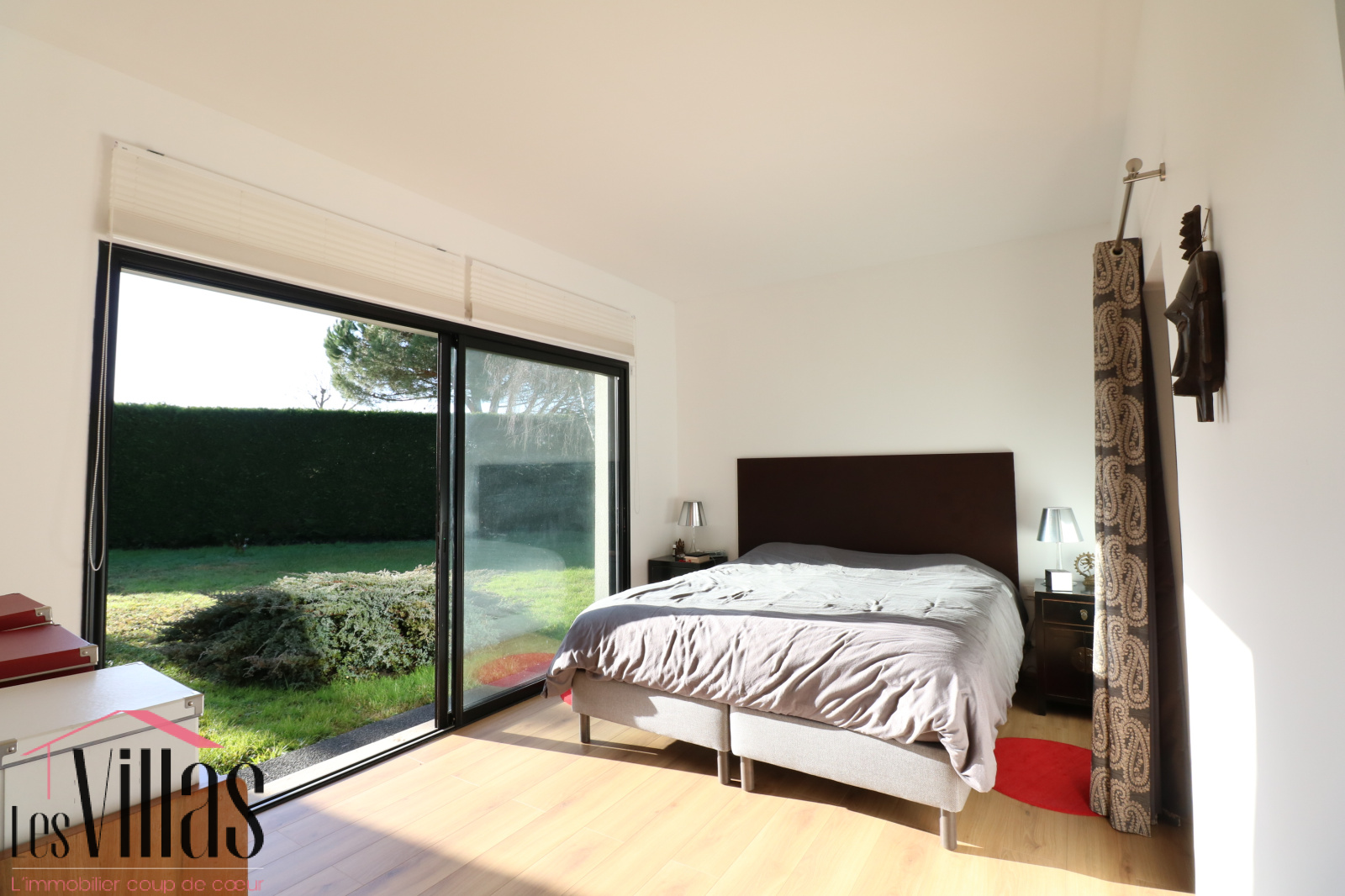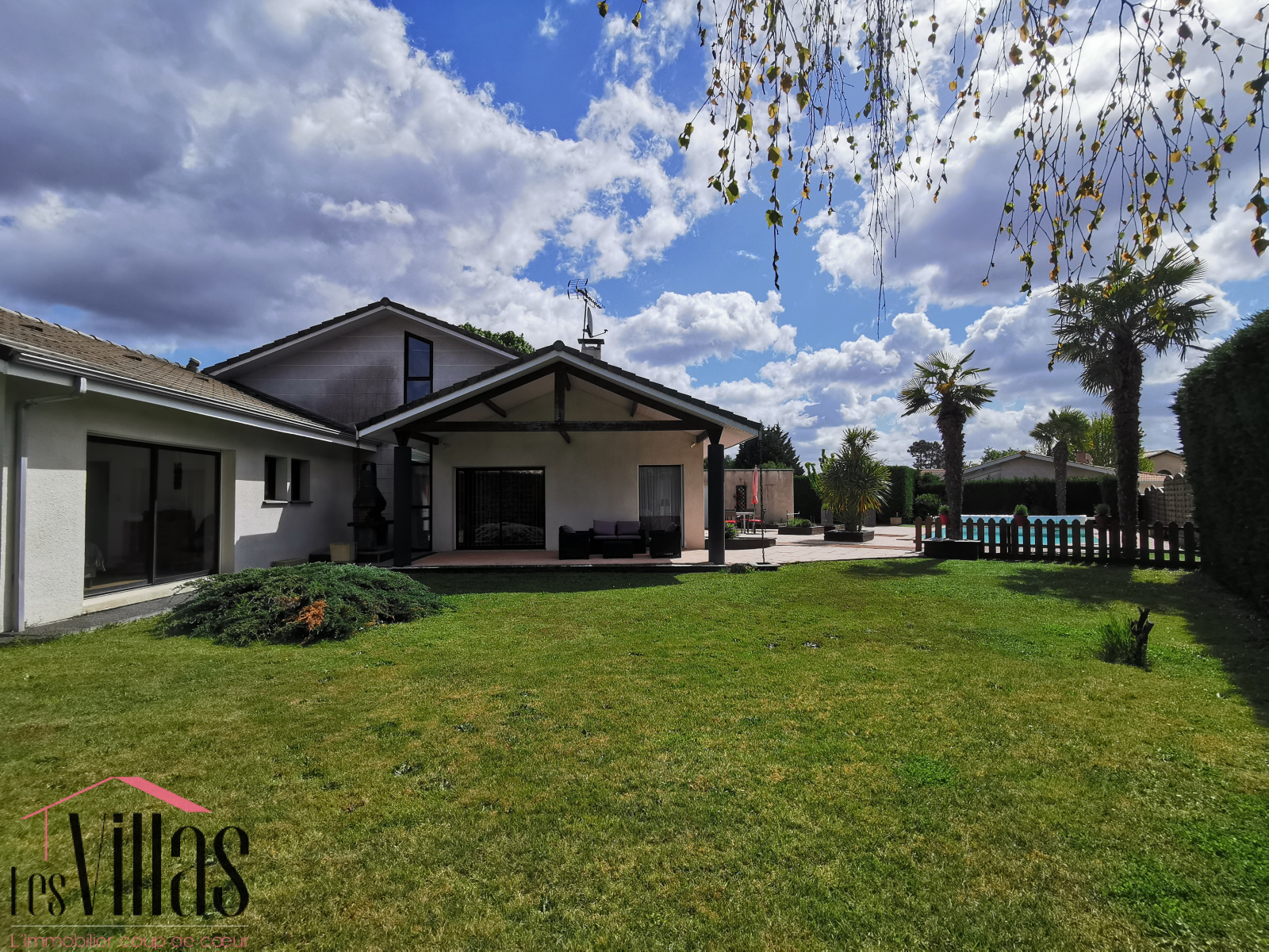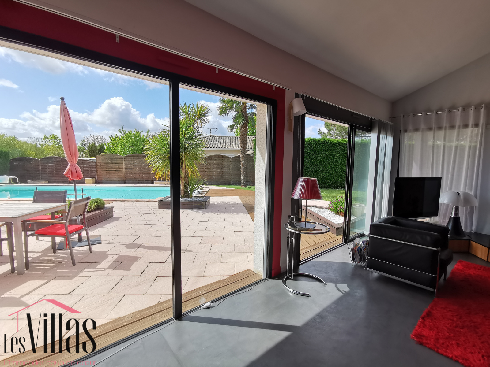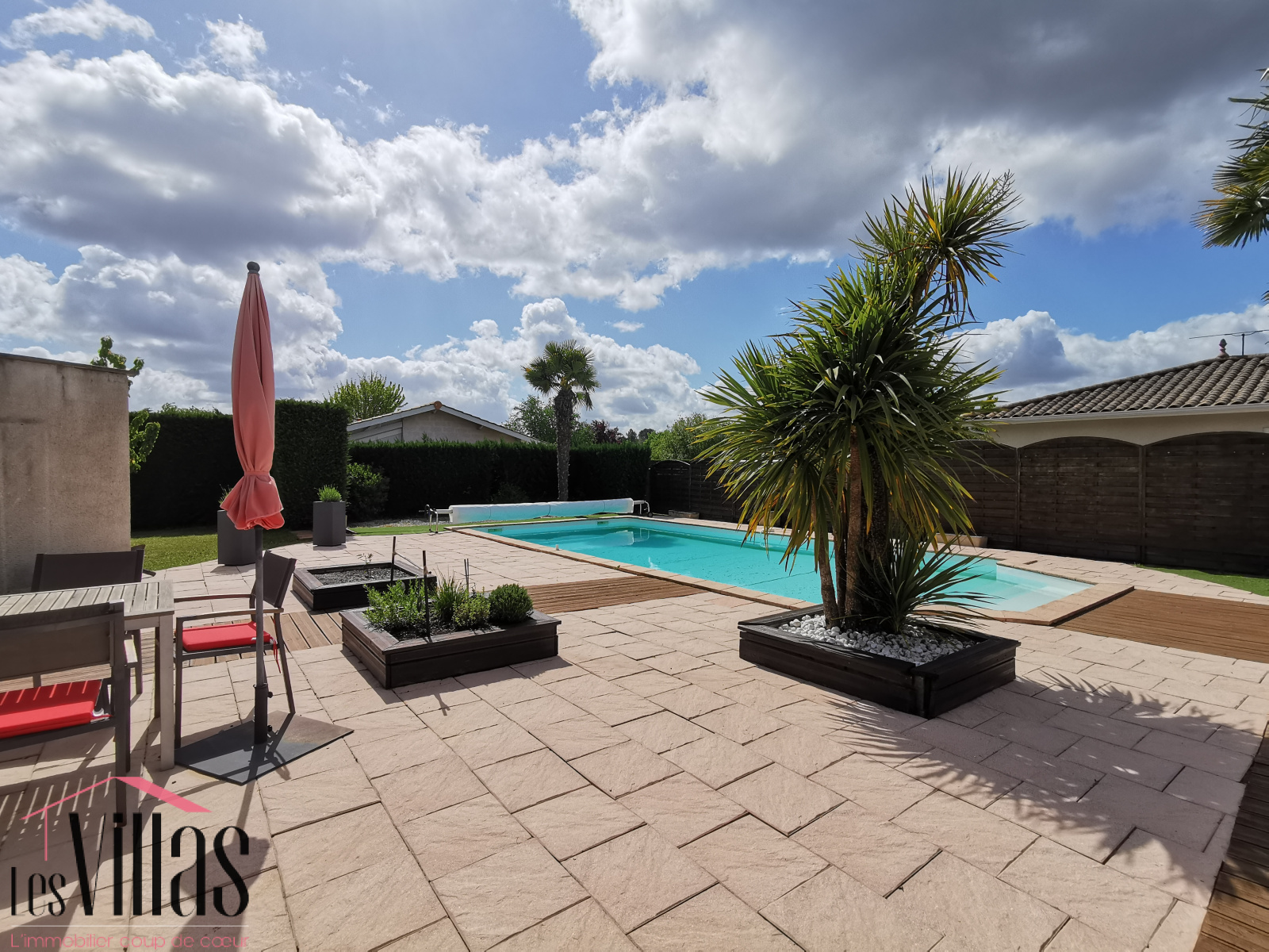 Exclusivité LES VILLAS. Découvrez cette belle villa contemporaine au calme. La maison offre une superbe pièce de vie baignée de lumière grâce à de larges baies vitrées donnant sur la piscine, une cuisine américaine et un bureau. Le coin nuit comporte deux chambres, une salle de bain et une belle suite parentale avec salle d'eau et dressing. A l'étage vous profiterez d'une grande mezzanine pouvant faire office de salle de jeux. Un cellier, un double garage, un abri voiture complètent ce bien aux prestations de qualité (chauffage au sol, aspiration centralisée, puits, sol béton ciré, alarme) La parcelle de 1350m² offre un vaste jardin paysagé, d'agréables terrasses et une piscine au sel sécurisée. La villa se situe au pied de la piste cyclable, dans un quartier calme et résidentiel, à 10mn du centre-ville, 30mn de Bordeaux, 2mn du futur tram et 35mn des plages. Cette maison est reliée à la fibre. Une maison de vacances pour toute l'année !