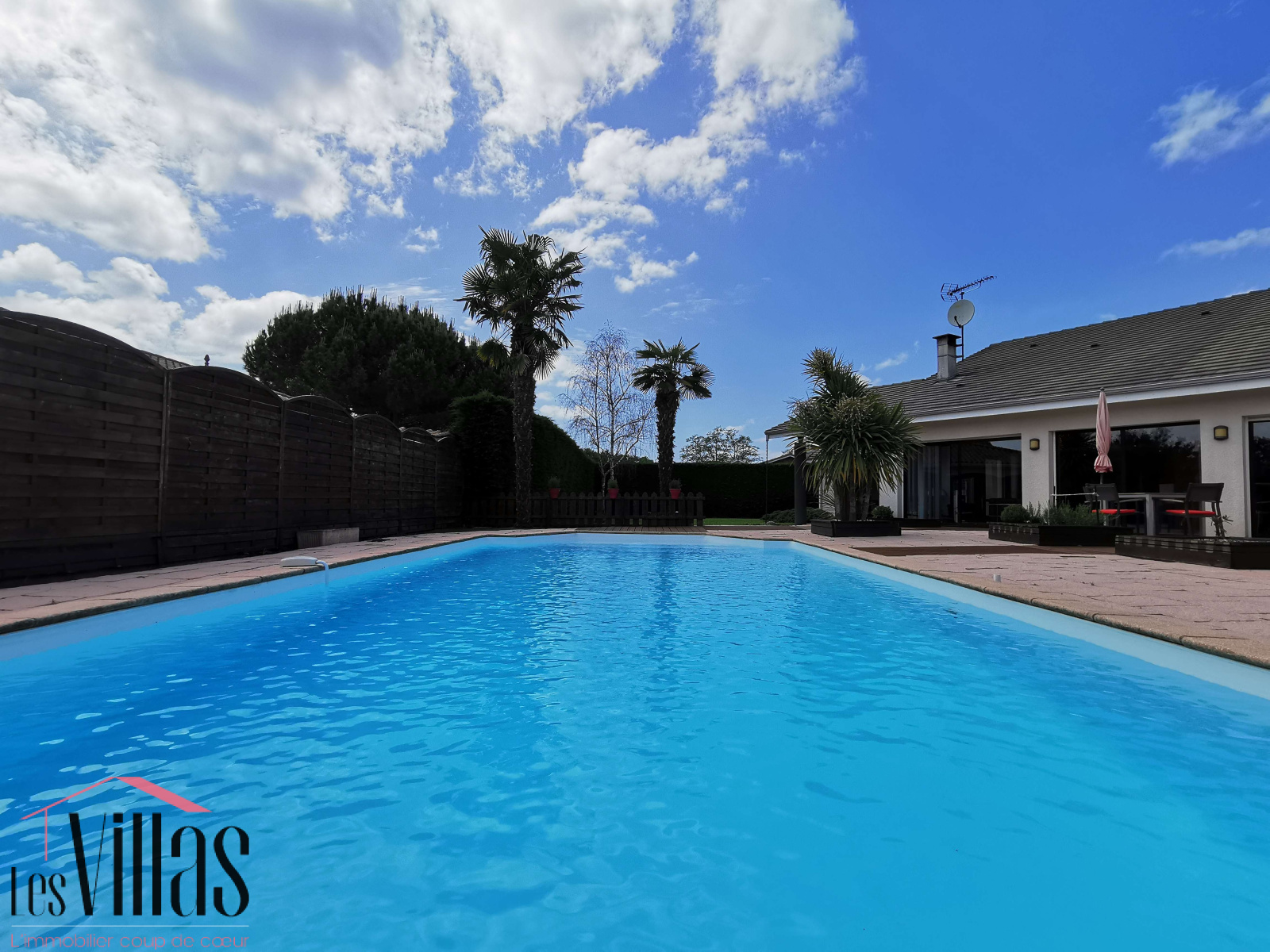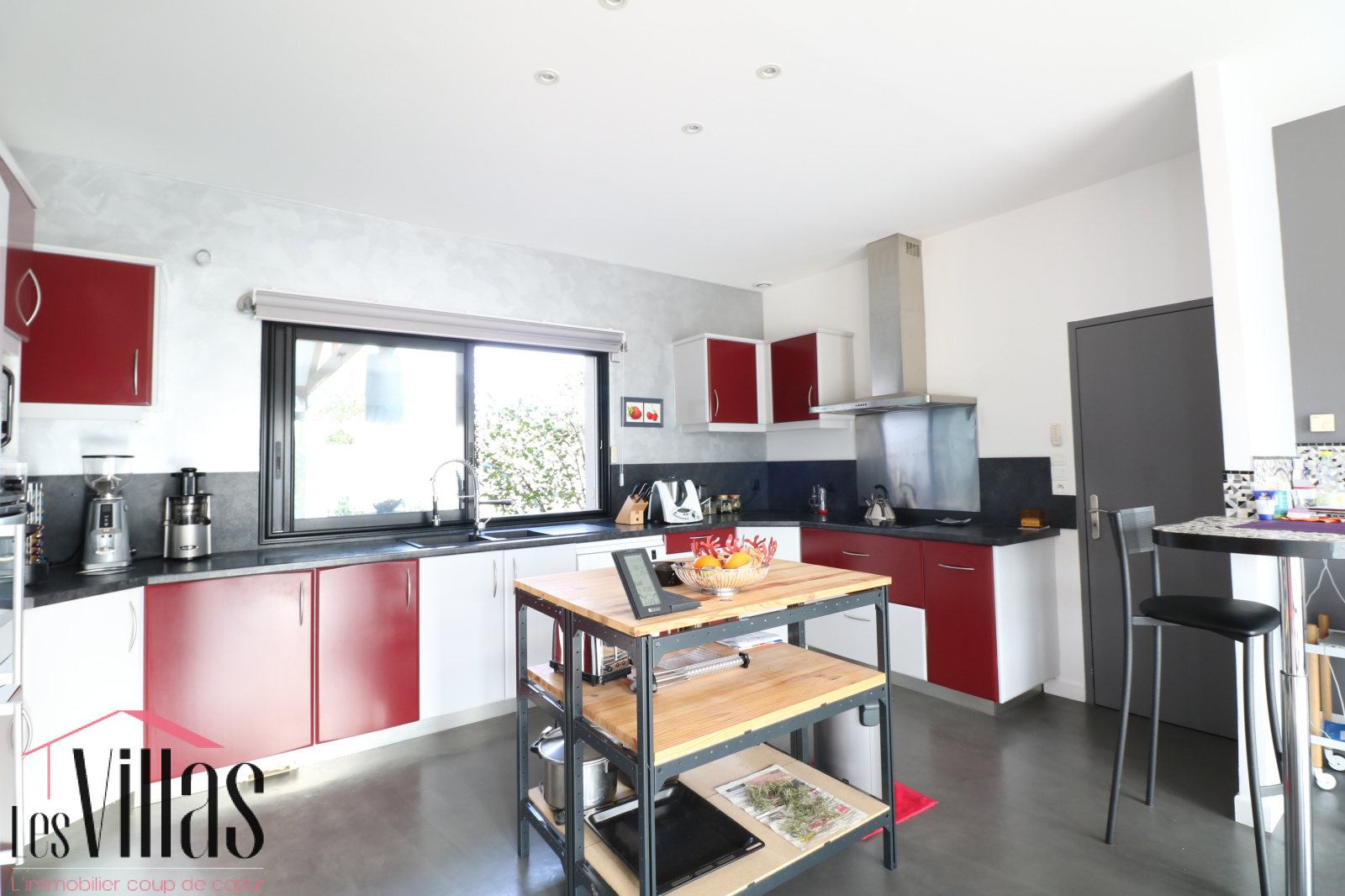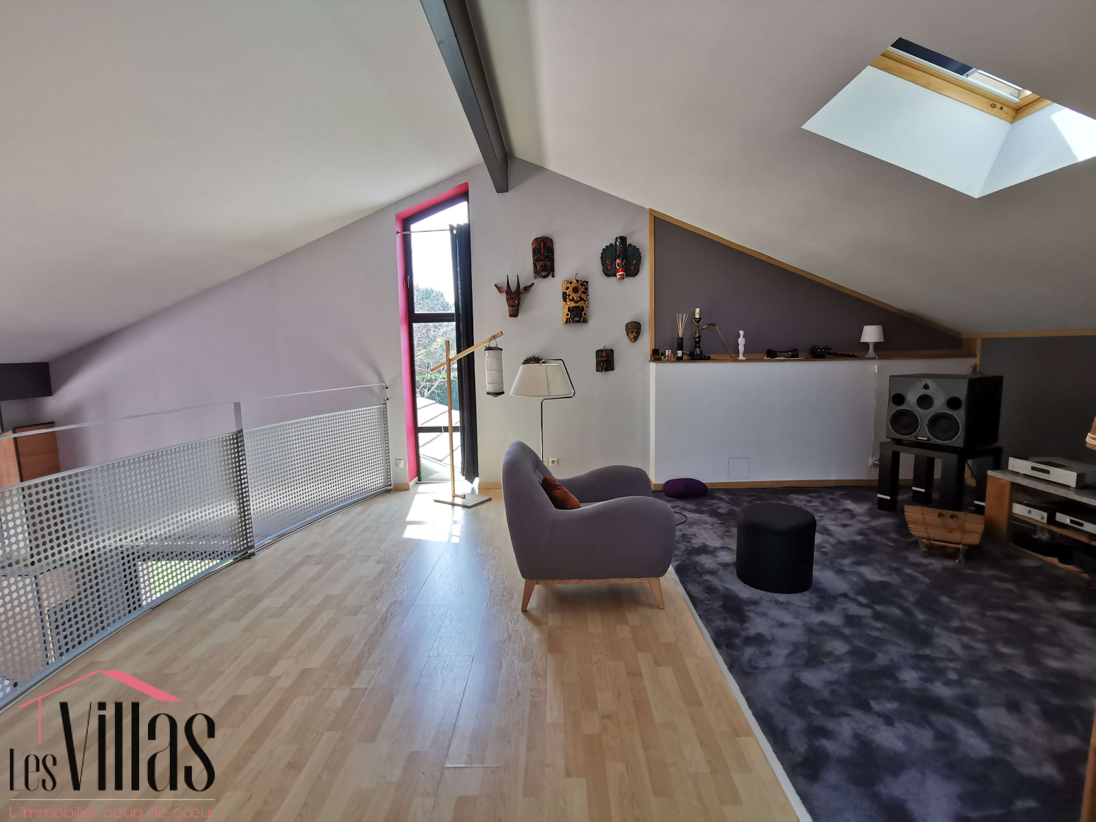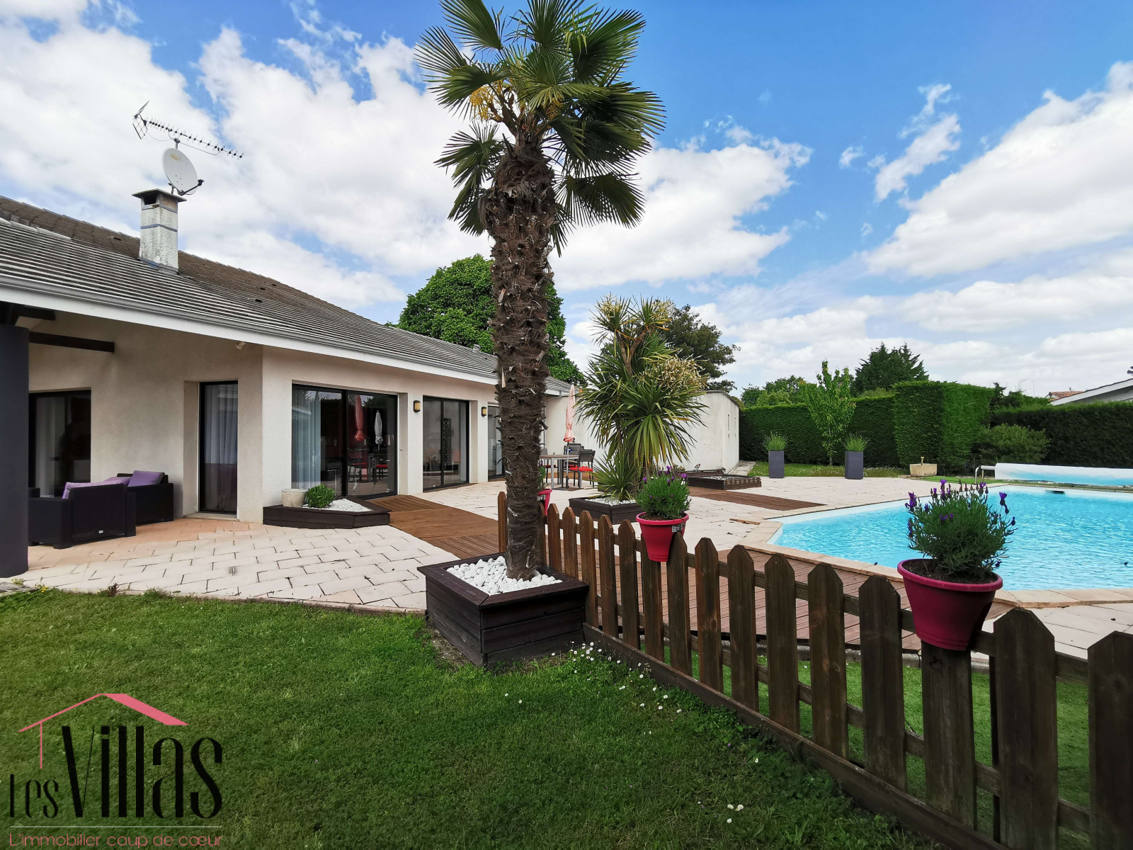 Exclusivité LES VILLAS. Découvrez cette belle villa contemporaine au calme. La maison offre une superbe pièce de vie baignée de lumière grâce à de larges baies vitrées donnant sur la piscine, une cuisine américaine et un bureau. Le coin nuit comporte deux chambres, une salle de bain et une belle suite parentale avec salle d'eau et dressing. A l'étage vous profiterez d'une grande mezzanine pouvant faire office de salle de jeux. Un cellier, un double garage, un abri voiture complètent ce bien aux prestations de qualité (chauffage au sol, aspiration centralisée, puits, sol béton ciré, alarme) La parcelle de 1350m² offre un vaste jardin paysagé, d'agréables terrasses et une piscine au sel sécurisée. La villa se situe au pied de la piste cyclable, dans un quartier calme et résidentiel, à 10mn du centre-ville, 30mn de Bordeaux, 2mn du futur tram et 35mn des plages. Cette maison est reliée à la fibre. Une maison de vacances pour toute l'année !