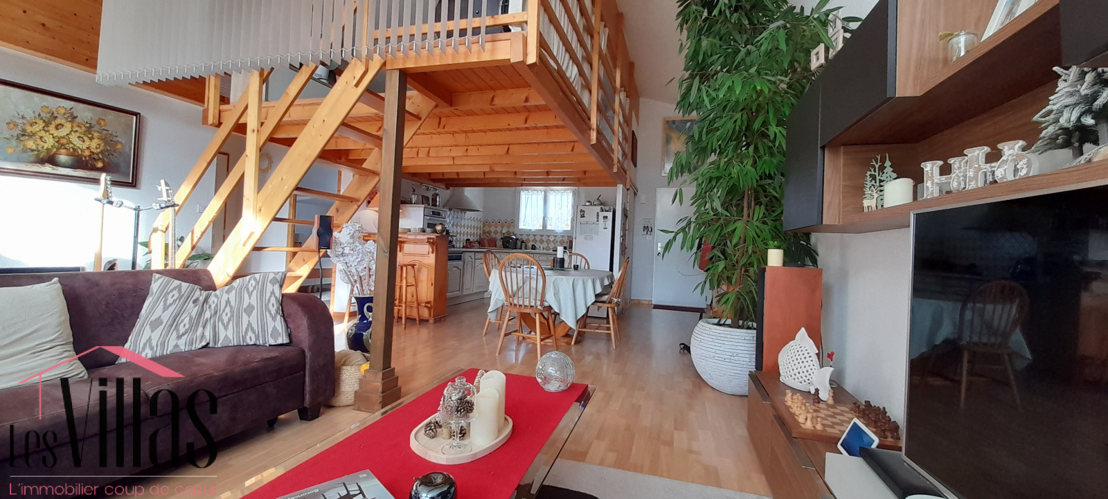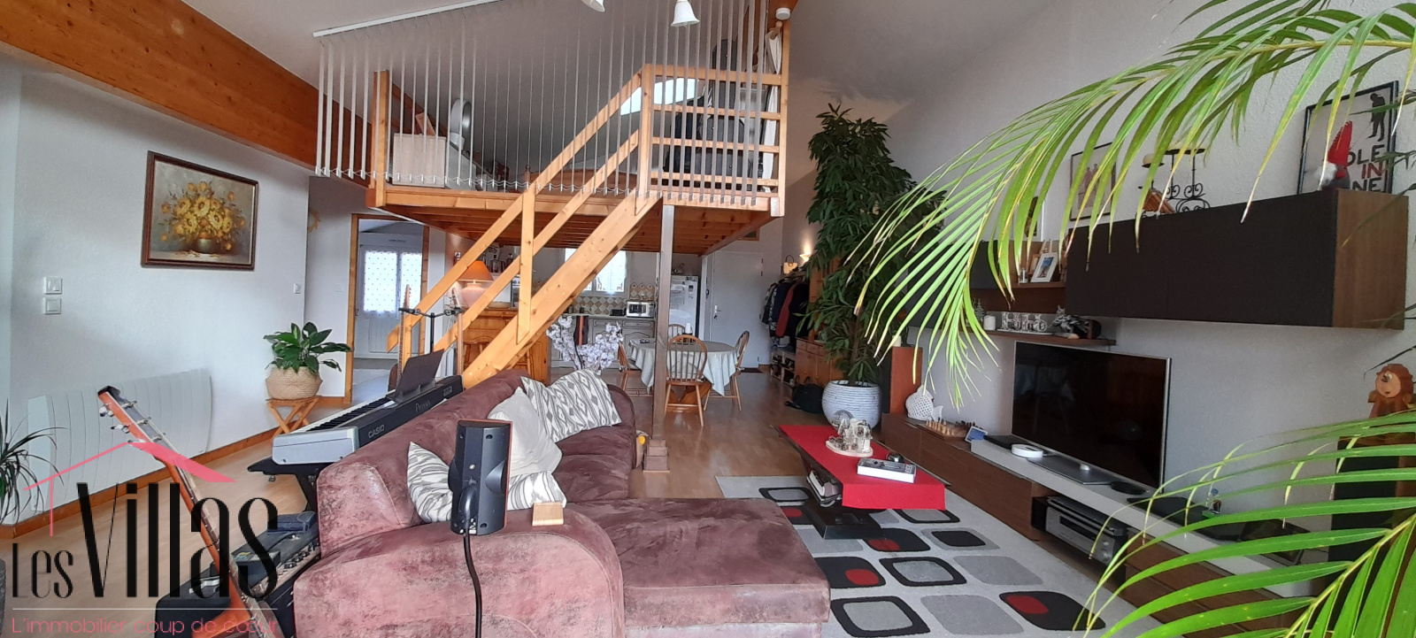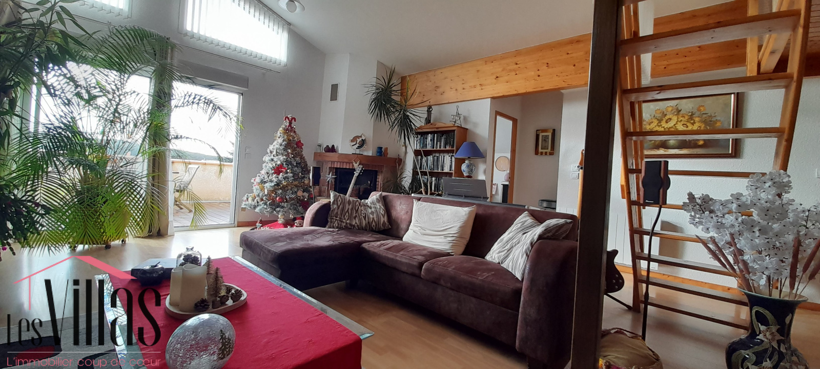 Le grand séjour avec son plafond cathédrale est agrémenté d'une cheminée avec insert et donne sur une belle terrasse en bois de 25 m2.