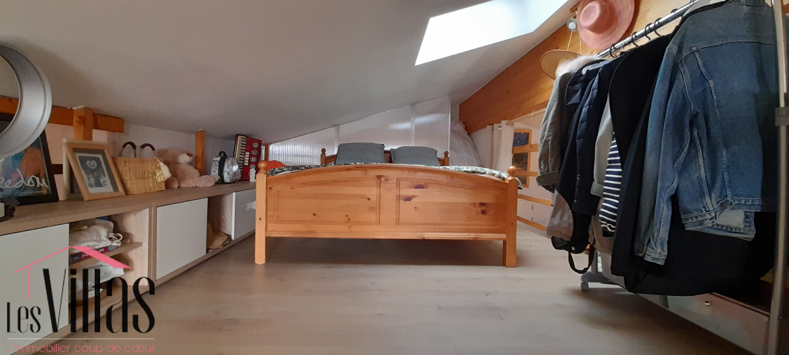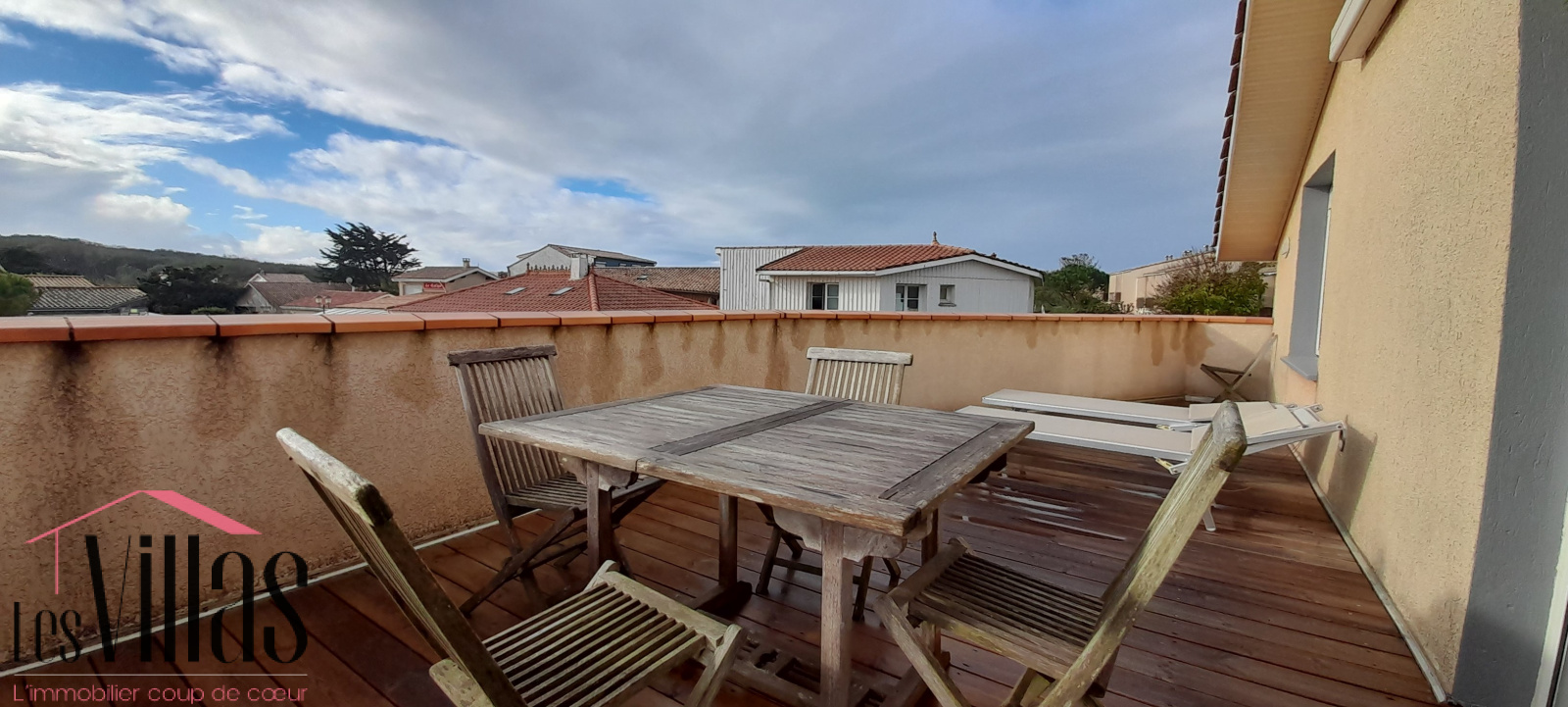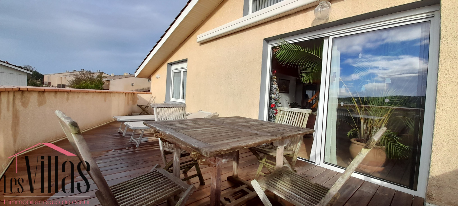 Le grand séjour avec son plafond cathédrale est agrémenté d'une cheminée avec insert et donne sur une belle terrasse en bois de 25 m2.