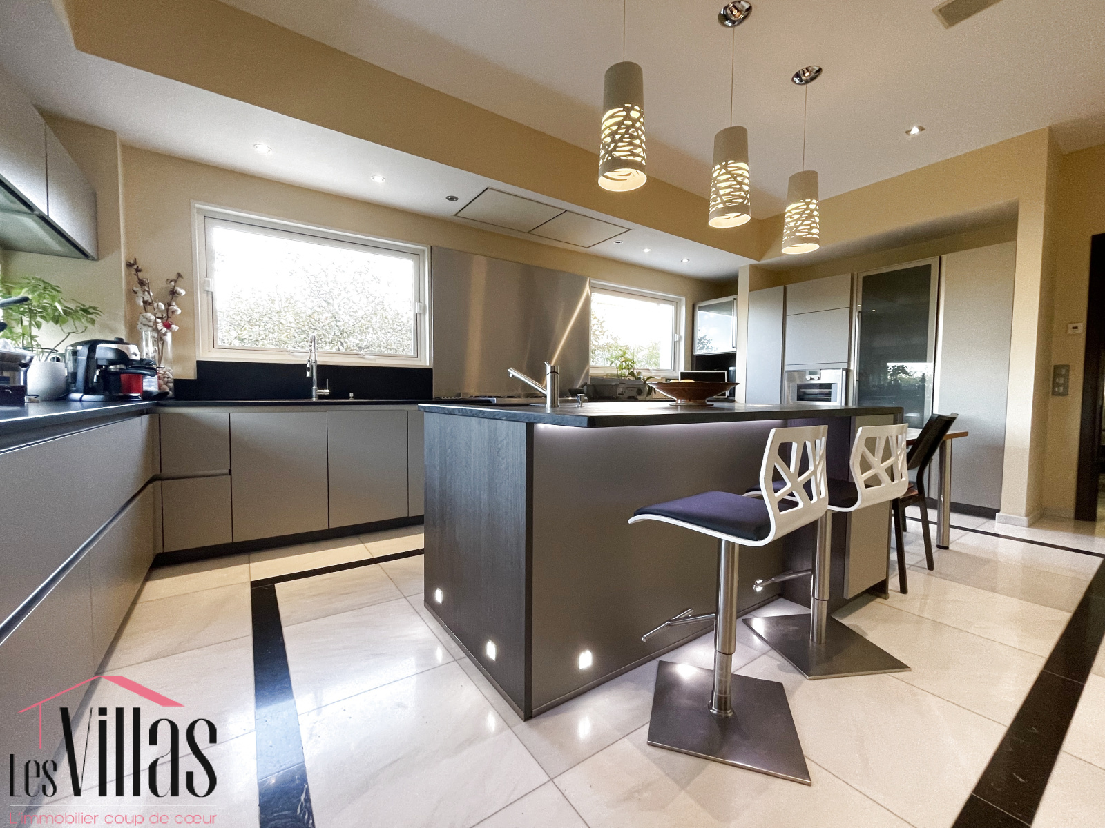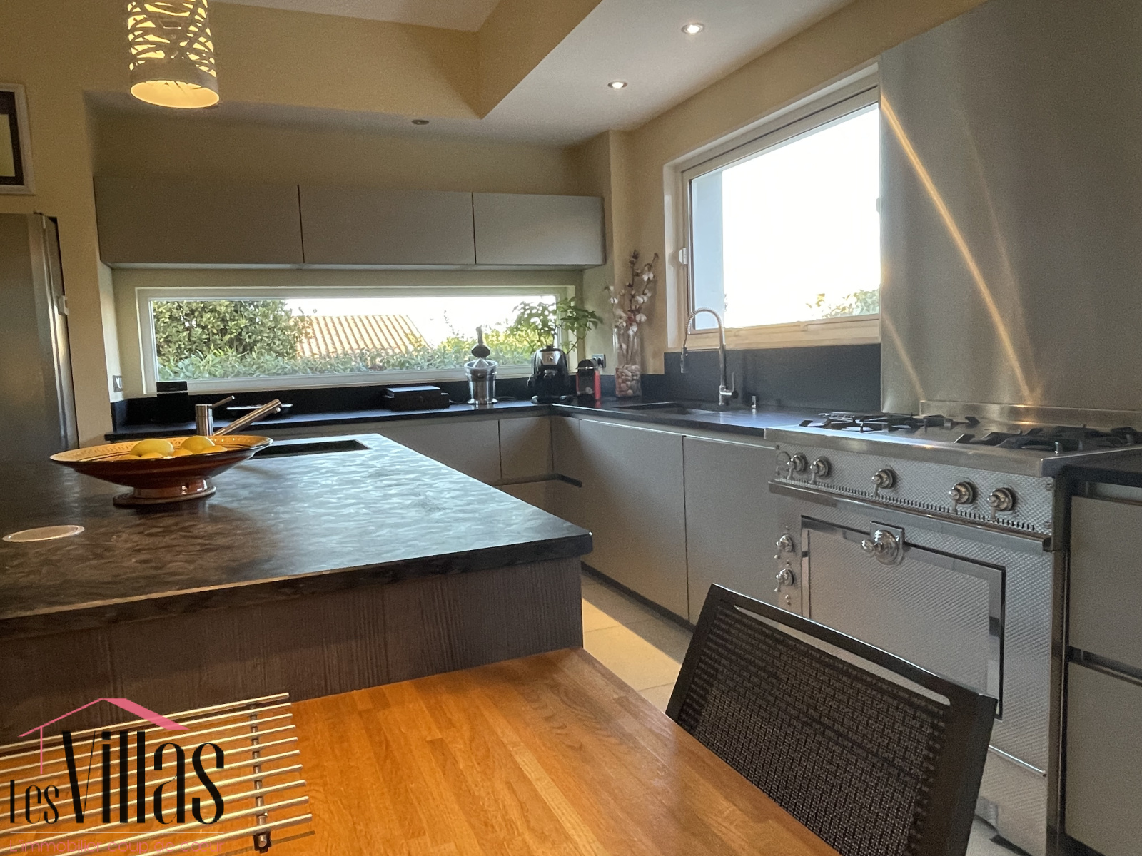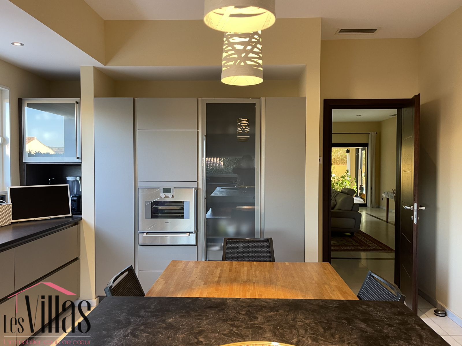 Le séjour d’environ 60 m2 s’ouvre largement sur une terrasse abritée, offrant une continuité harmonieuse entre les espaces intérieurs et extérieurs, idéale pour profiter des lieux en toute saison. La cuisine séparée a été pensée pour les amateurs de cuisine, elle permet aussi de partager de vrais moments de convivialité autour de l'îlot central en famille ou entre amis. Elle est complétée par un cellier disposant d’un accès direct depuis l’extérieur, apportant un véritable confort d’organisation.