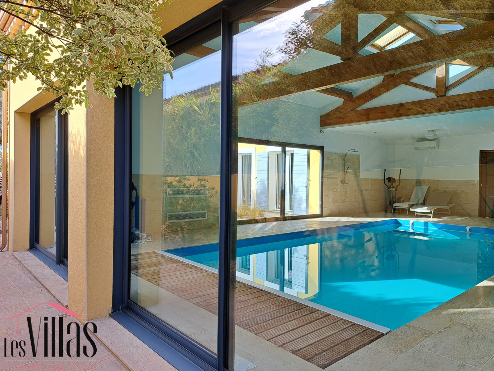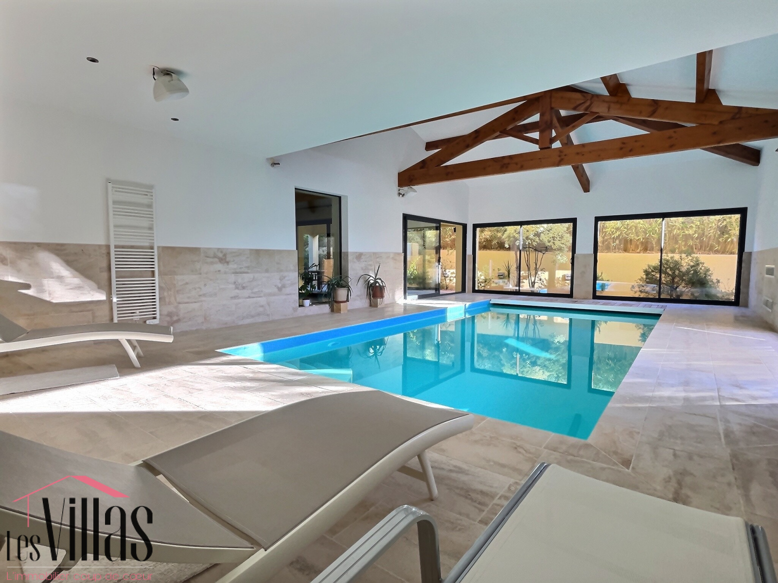 Aux pièces de vie s’ajoute un vaste espace de près de 85 m2, baigné de lumière grâce à de grandes baies vitrées. Ce lieu aux volumes remarquables, sublimé par un plafond cathédral avec poutres apparentes, accueille une piscine intérieure chauffée de 8 x 4 m et s’ouvre sur une très belle terrasse en travertin, créant un espace unique dédié au bien-être et à la détente, utilisable toute l’année.