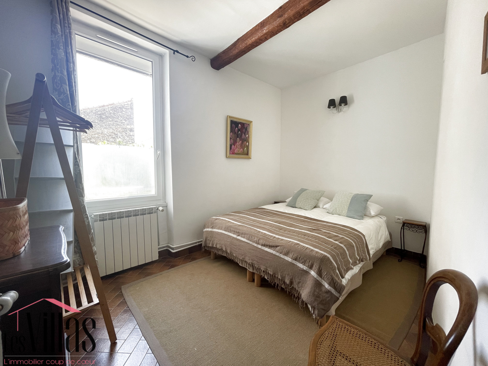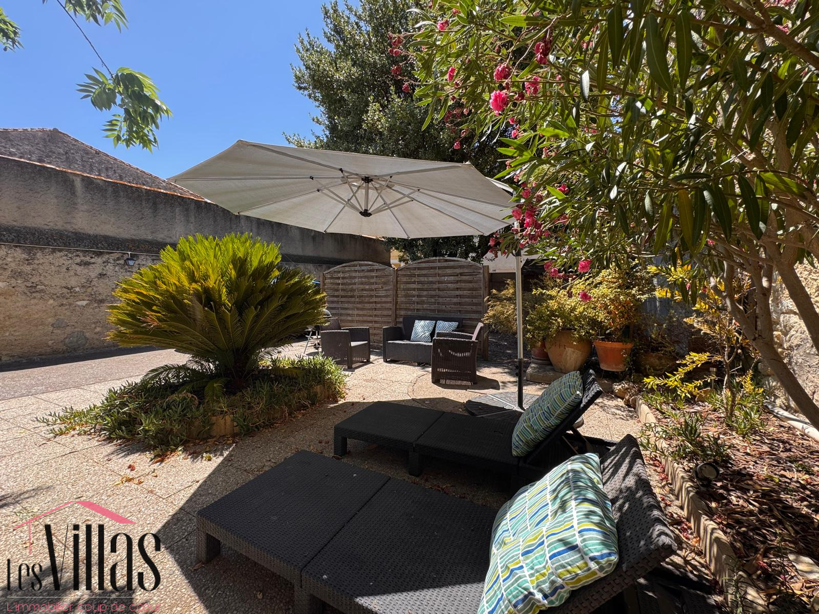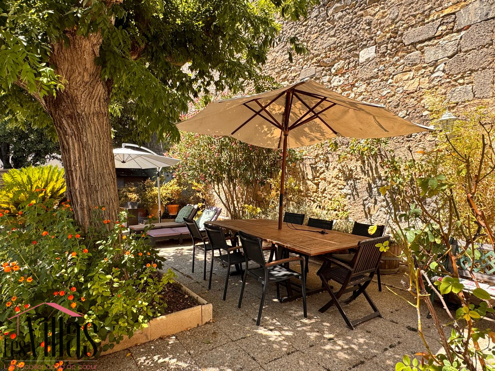 Rare pour une maison de village ou les commerces sont accessibles à pied, le terrain à l’avant est aménagé en terrasse végétalisée, véritable havre de fraîcheur et de sérénité, avec un cabanon pour le rangement.