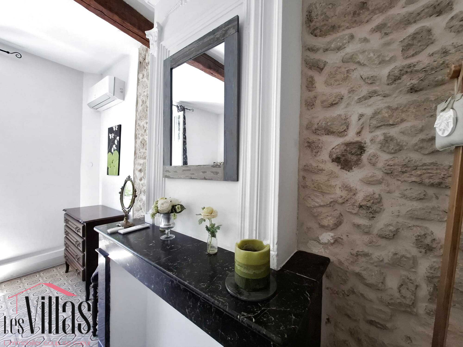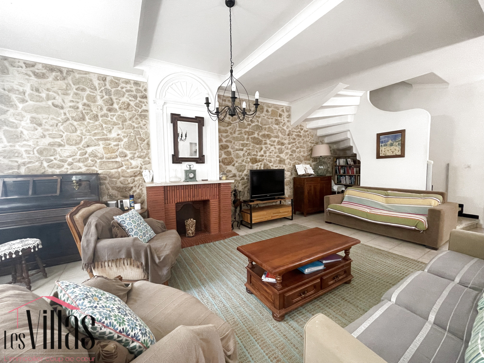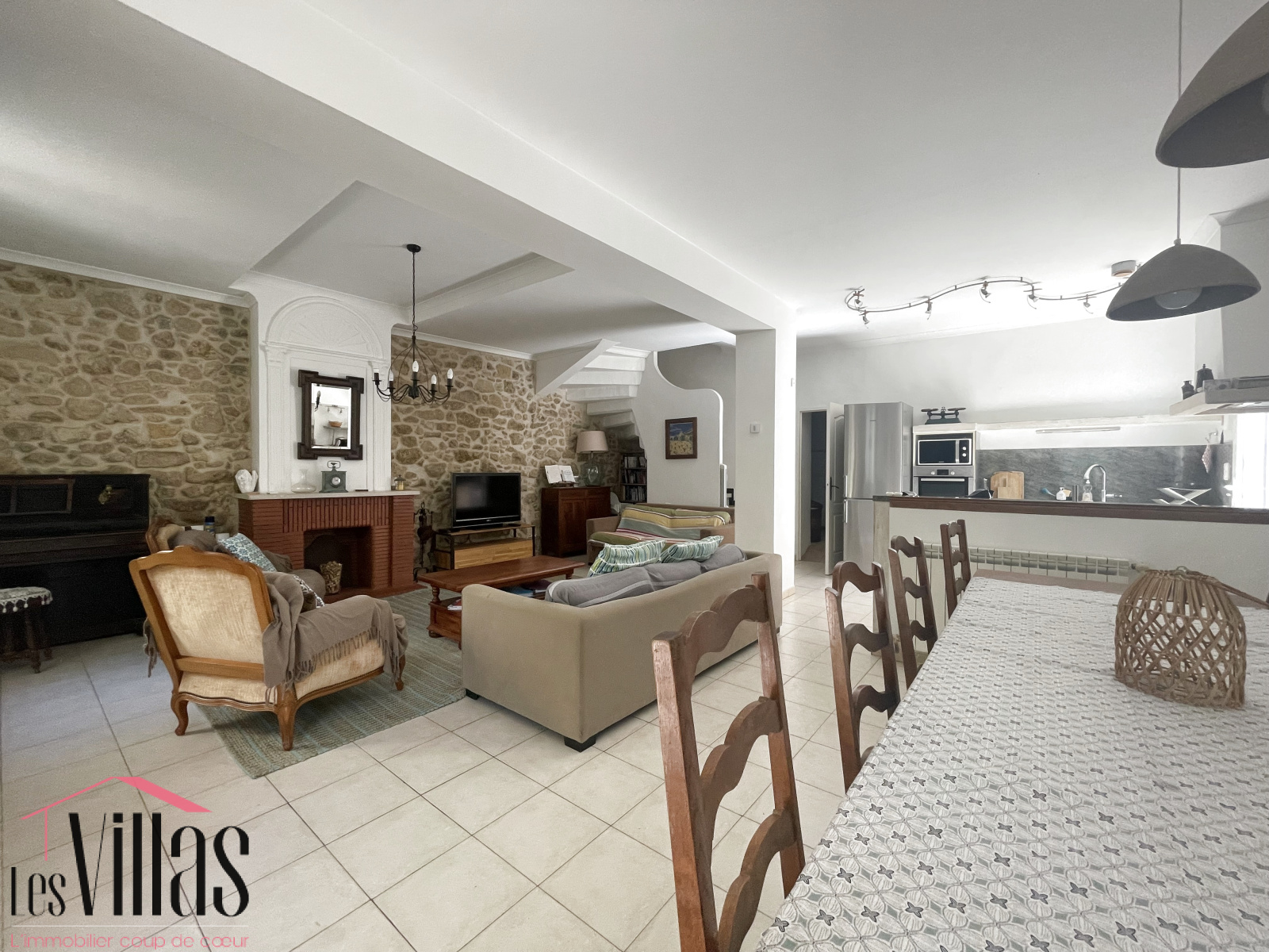 Dès l’entrée, le charme opère avec une grande pièce de vie chaleureuse où se mêlent pierres apparentes, cheminée décorative et beaux volumes. La cuisine, ouverte et fonctionnelle, donne accès directement à l’espace extérieur. Une buanderie et des WC complètent ce niveau.