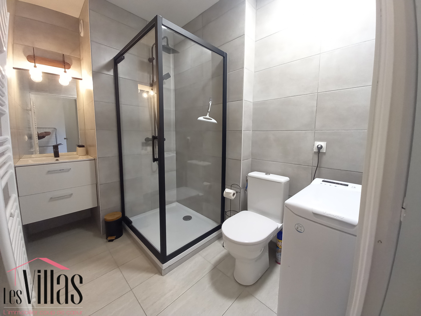 d'une belle salle de bain avec douche entièrement vitrée, lavabo, WC, et machine à laver, mur et sol carrelés.