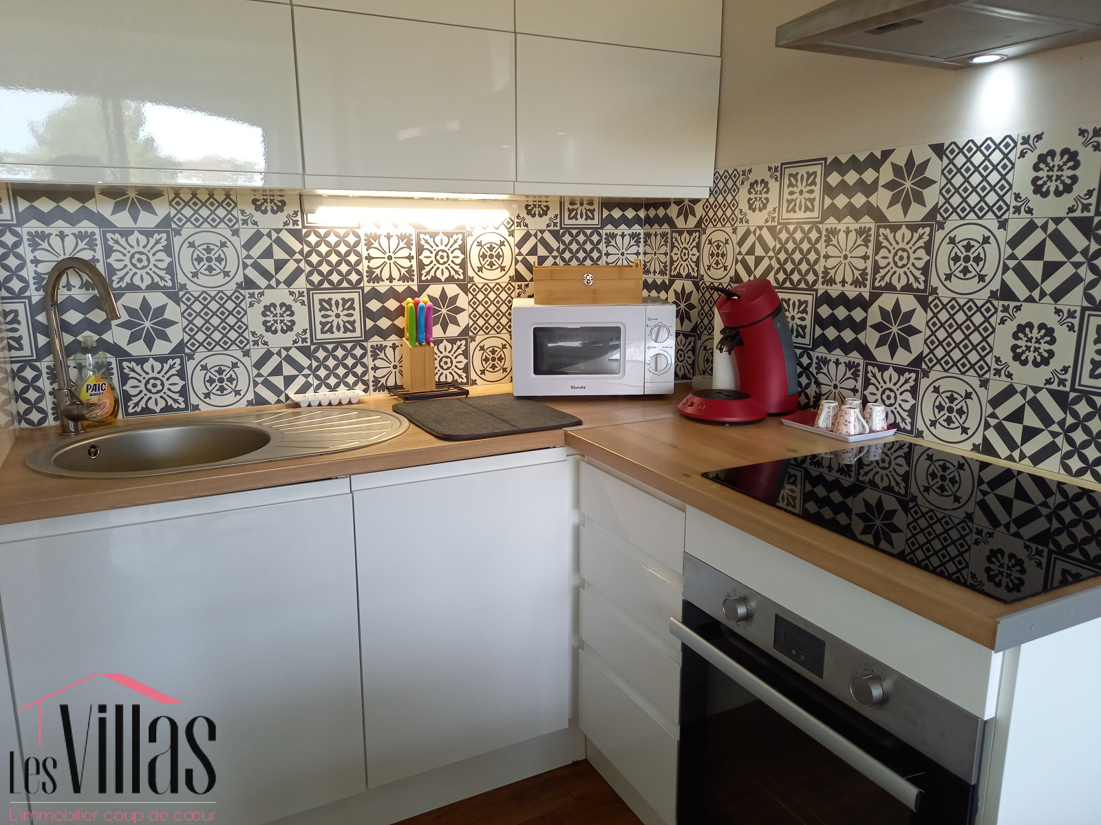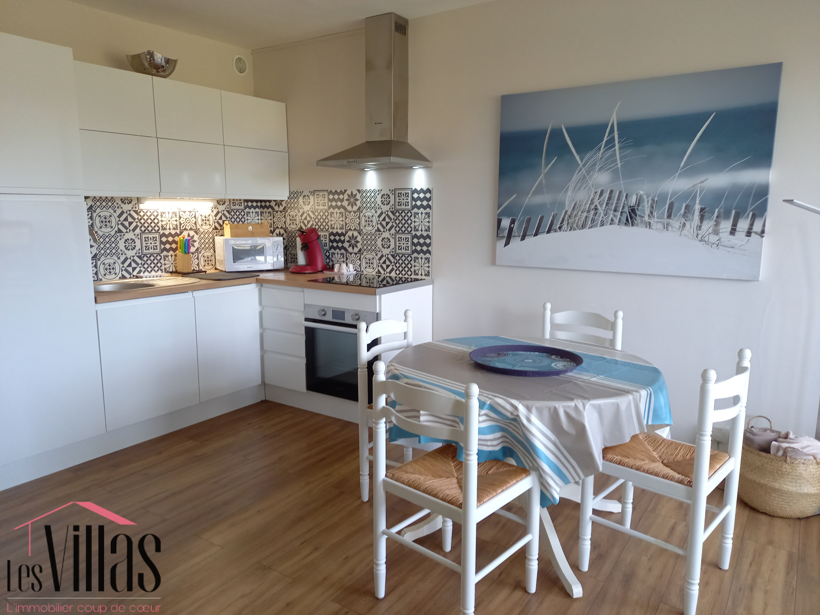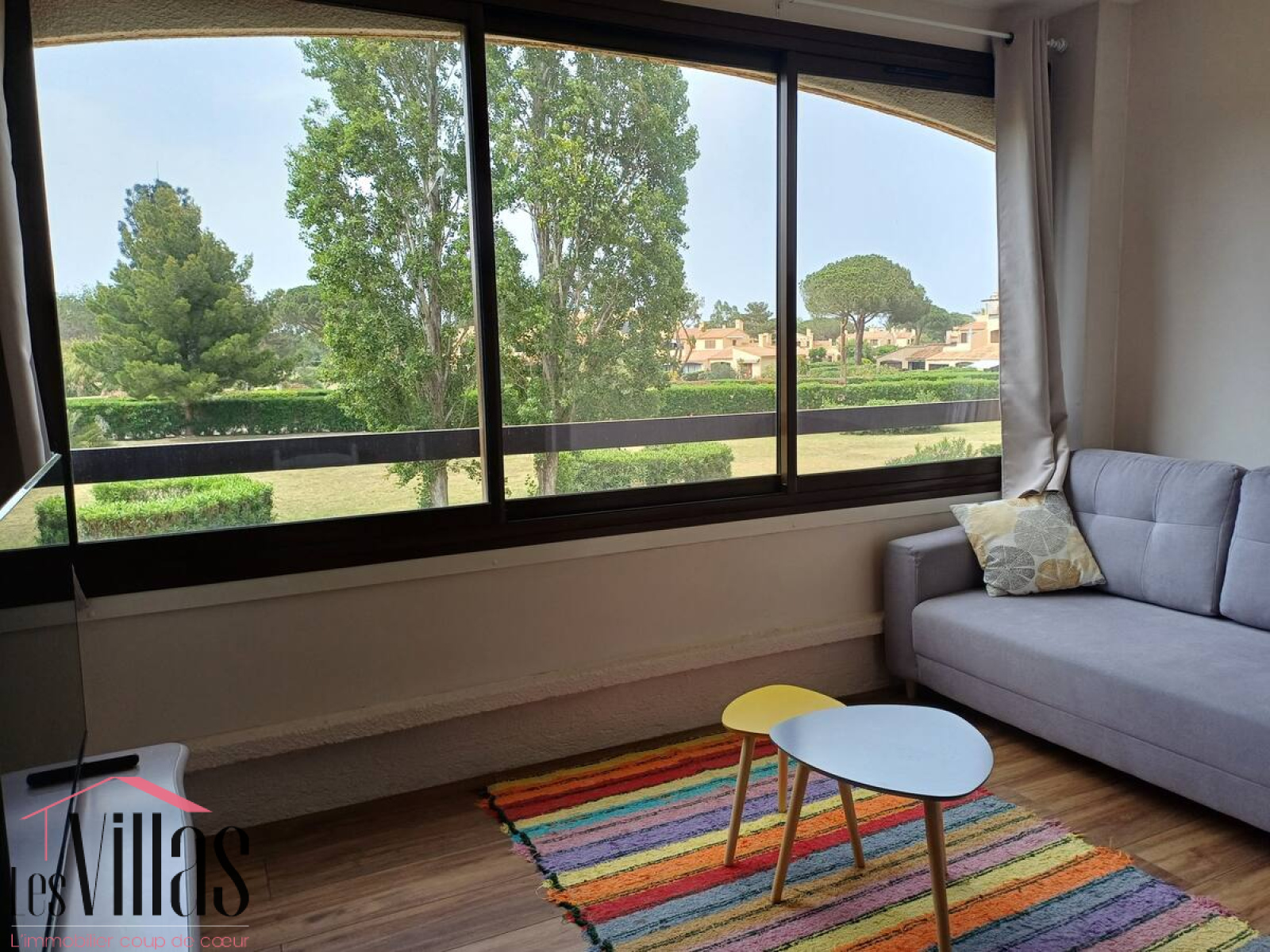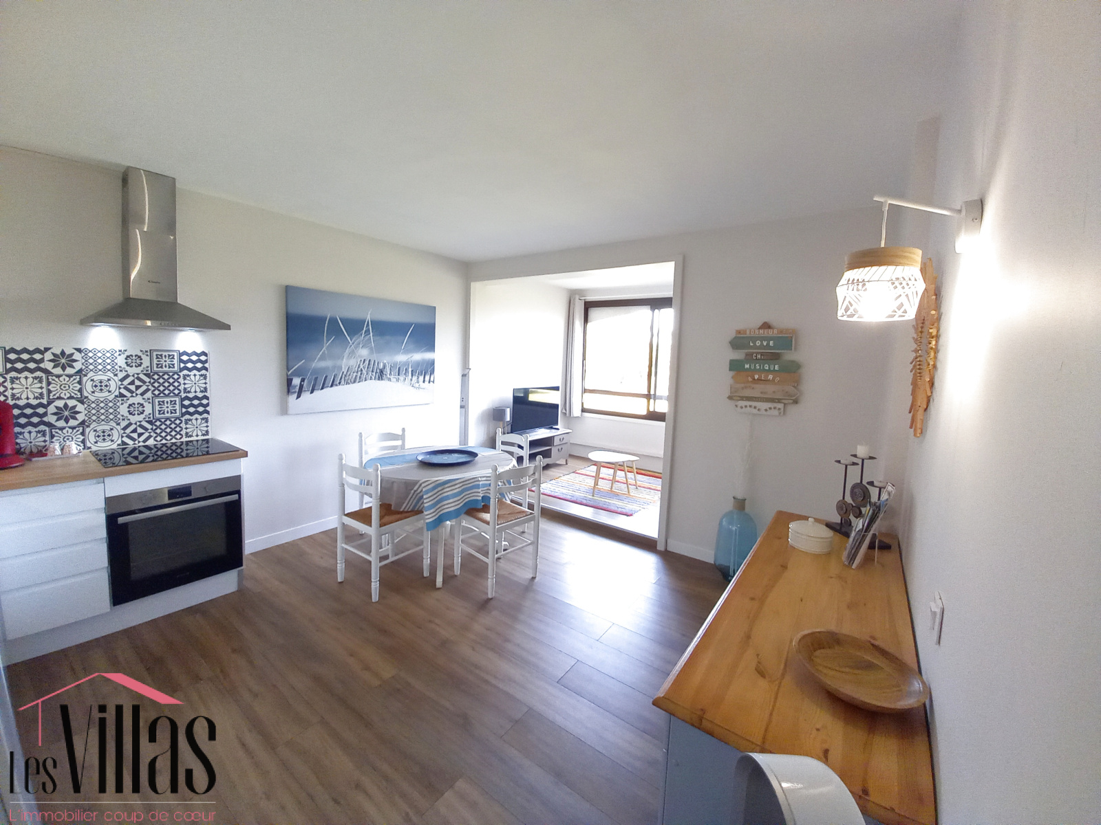 d'une belle pièce de vie avec cuisine encastrée moderne ( frigo congélateur,micro onde, cafetière, plaque vitro céramique,four etc..). la terrasse fermée par une baie coulissante vue sur parc, aménagée en salon TV avec canapé convertible, est baignée de lumière.