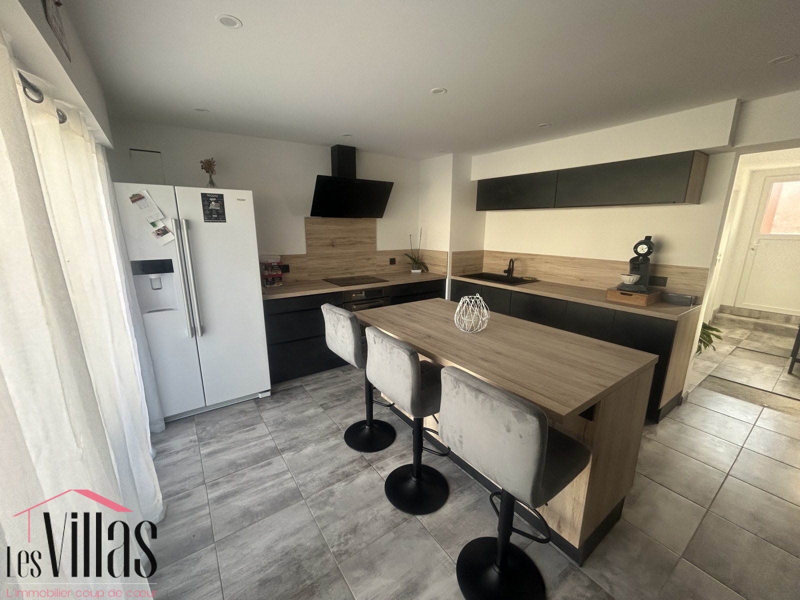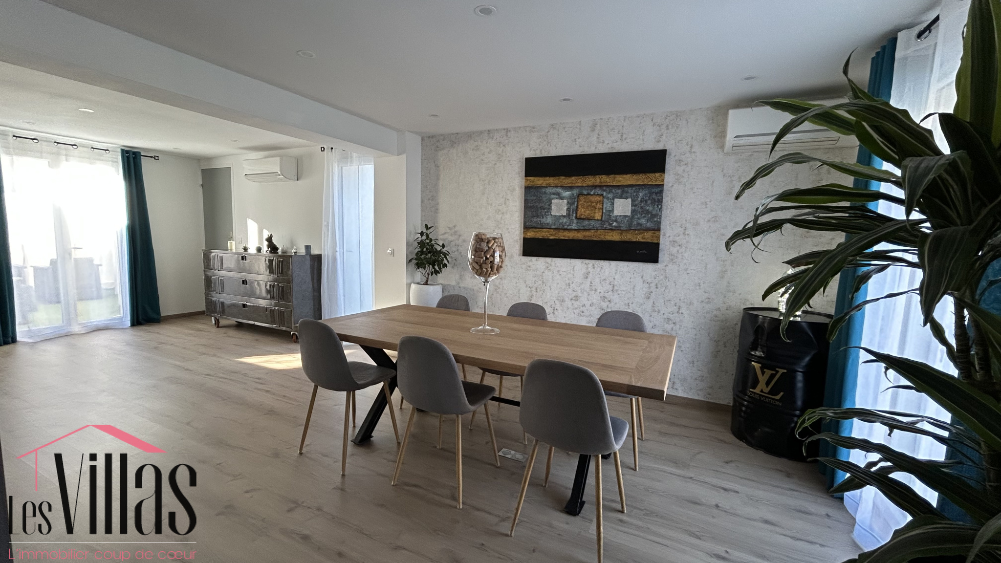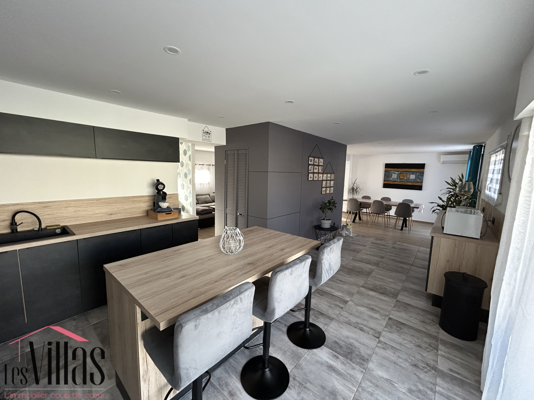 La grande pièce de vie avec sa cuisine ouverte, entièrement équipée développe une surface de 60 m², le tout donnant sur différentes terrasses et la piscine.