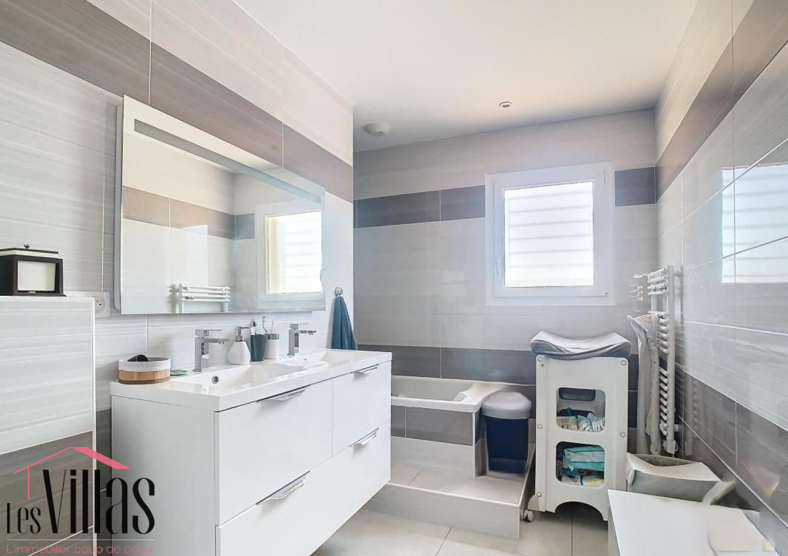 À l’étage, trois grandes chambres équipées de rangements intégrés ainsi qu’une cinquième pièce modulable selon vos envies complètent l’espace nuit.