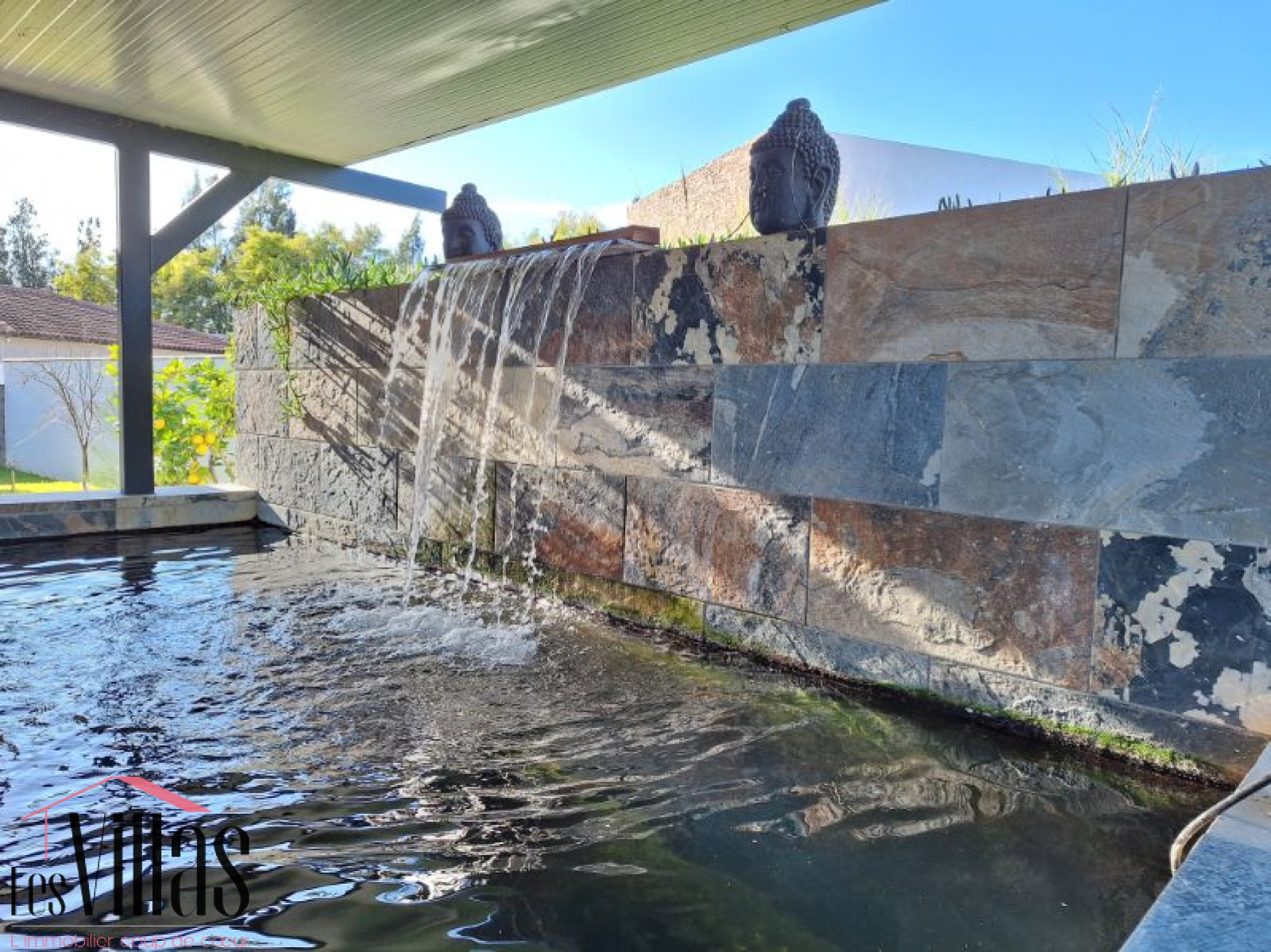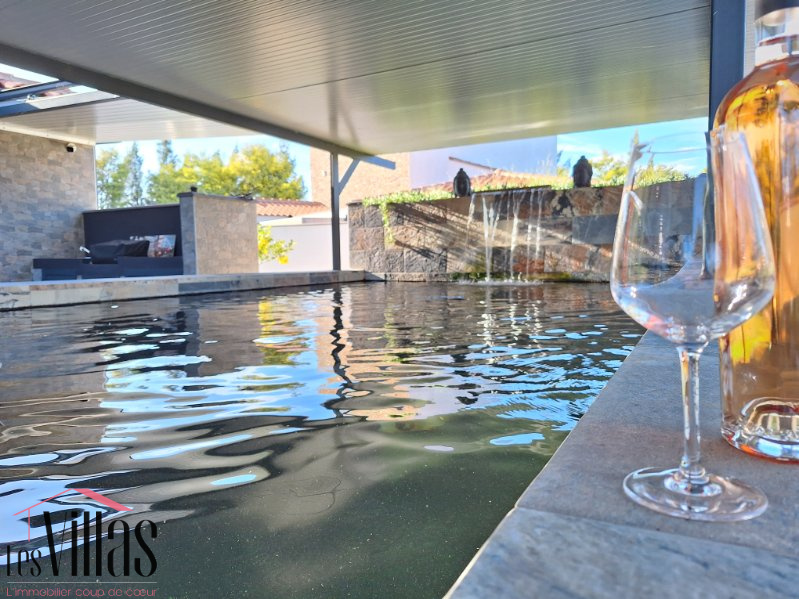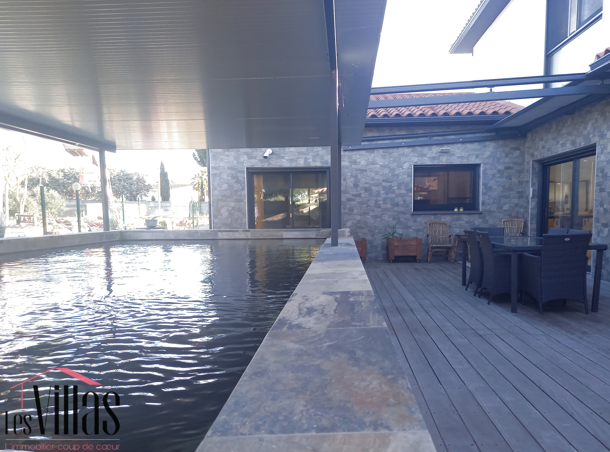 La piscine de 10 x 4 en pierre style bali, posséde une filtration automatisée aux UV. Cette eau pure circule en cascade ou jets et permet une baignade saine. La terrasse en lame de bois jouxte l'espace plancha pour des repas conviviaux à l'abri de deux stores électriques.