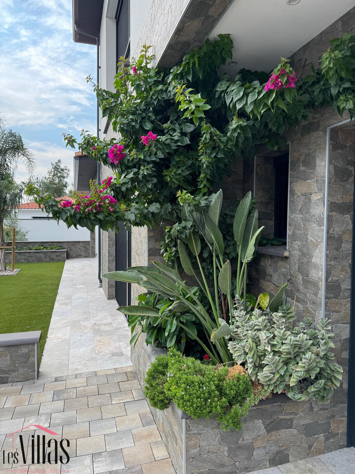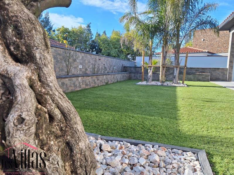 Le garage de 30 m2 est carrelé, isolé et climatisé. Le stationnement pour 3 à 4 véhicules est possible sur la parcelle par un large portail domotisé, comme le reste de la maison.