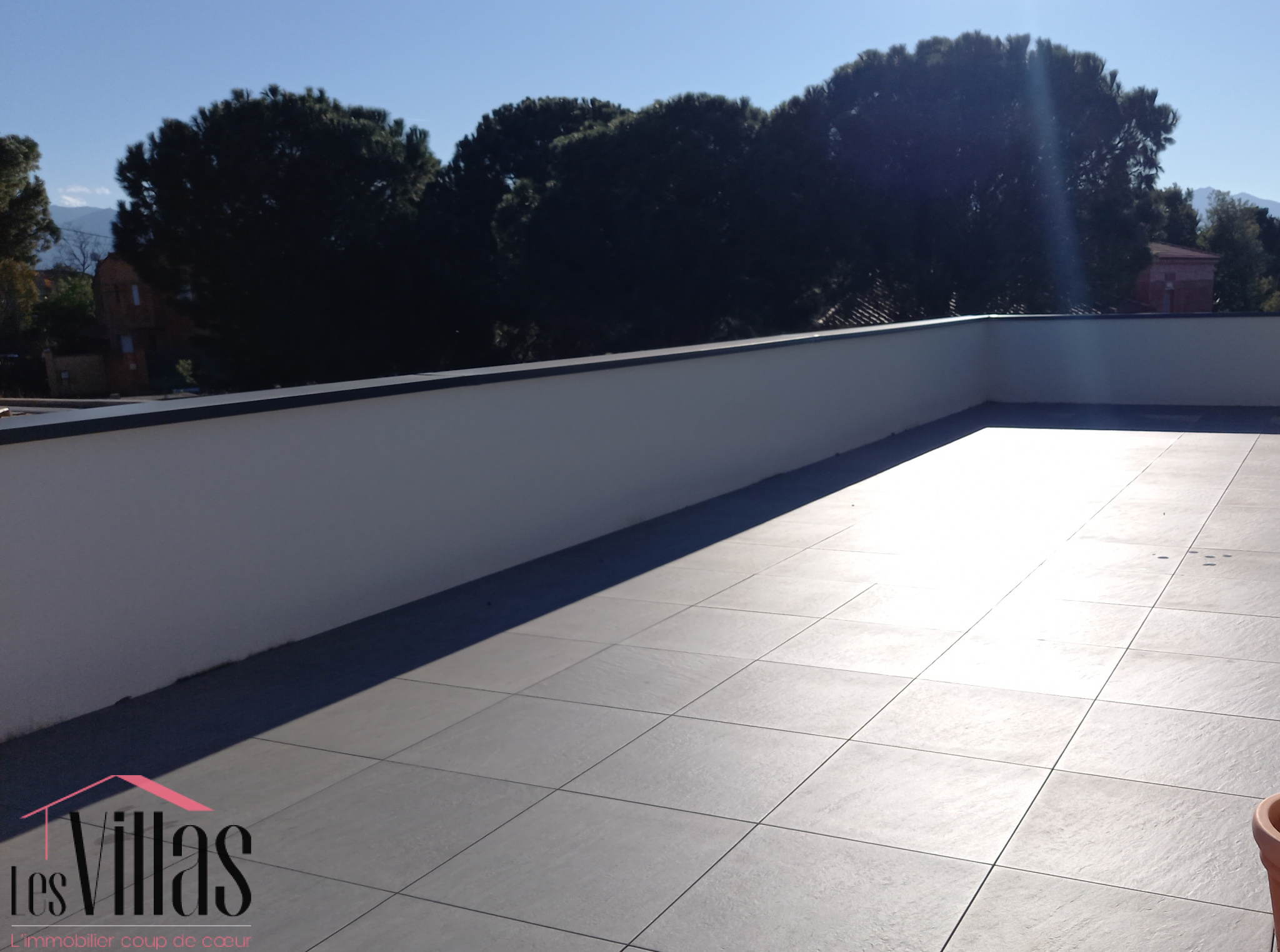Par un bel escalier métal et céramique, on accéde à une vaste pièce de 53 m2 donnant sur une terrasse avec vue de 50 m2. Actuellement aménagée en salon cinéma.