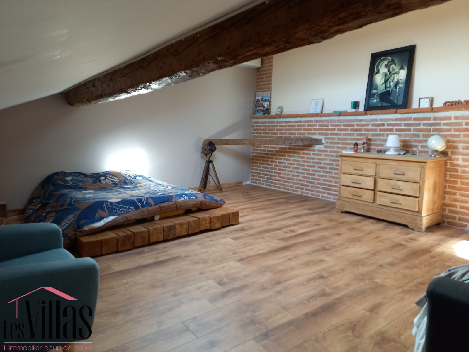 Le deuxième étage mansardé est privatif avec une très belle chambre parentale, un dressing et une salle de bains complète (baignoire et douche) , une autre chambre avec rangements (2 dressings).