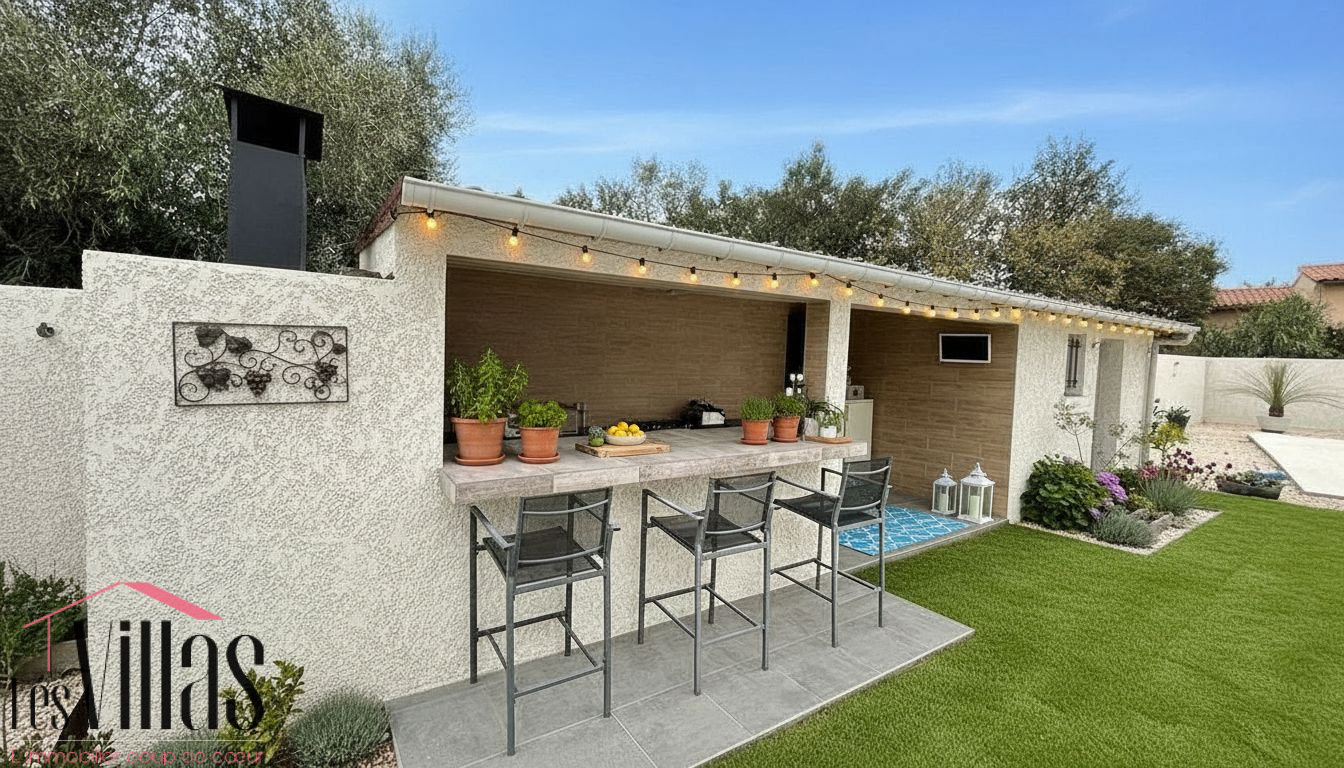 Côté extérieur: Une grande piscine de 7m x 3,5m entourée d'une belle terrasse, une cuisine d'été entièrement équipée avec BBQ vous offrent un bel espace détente pour de beaux moments de partage.