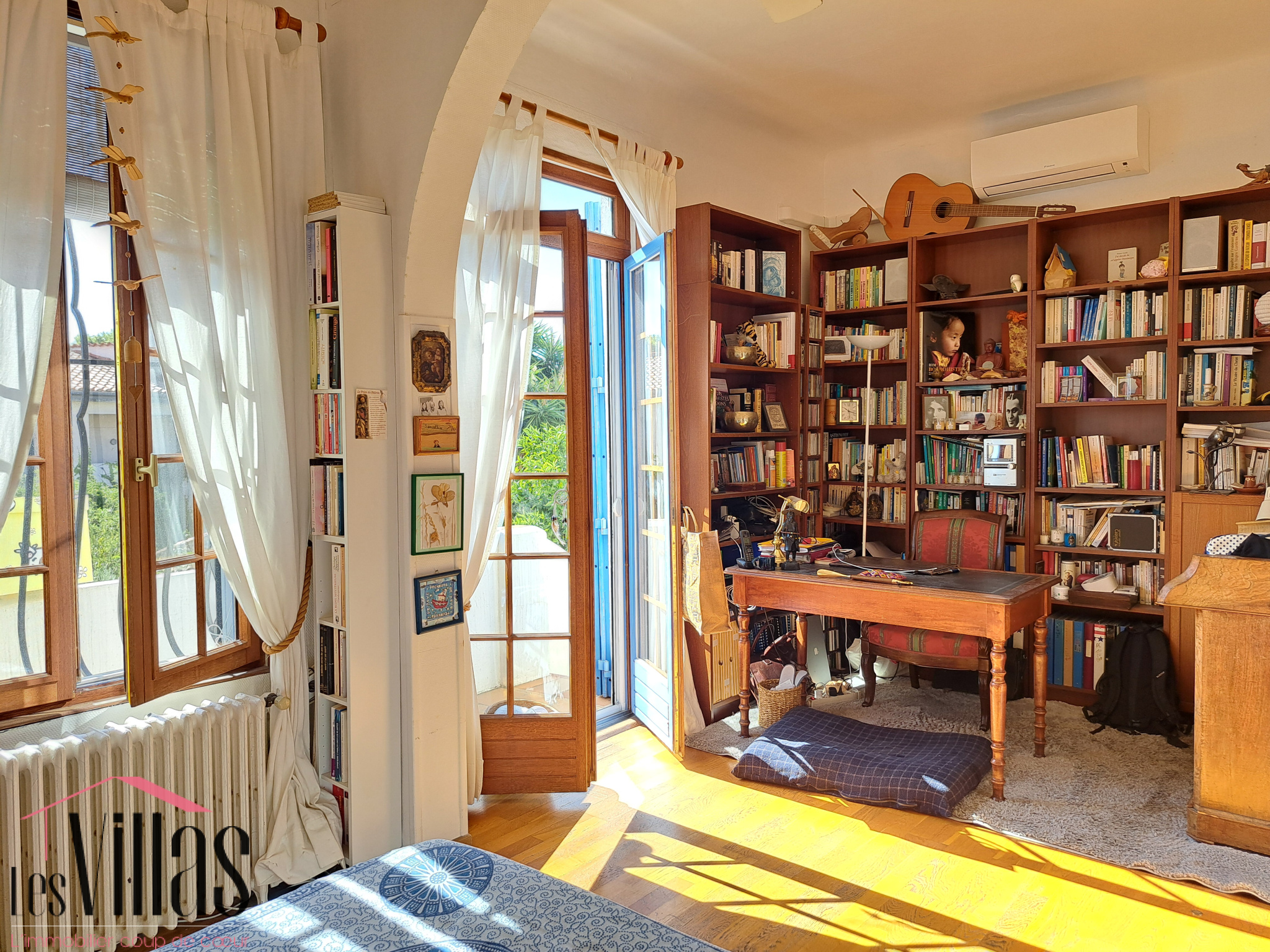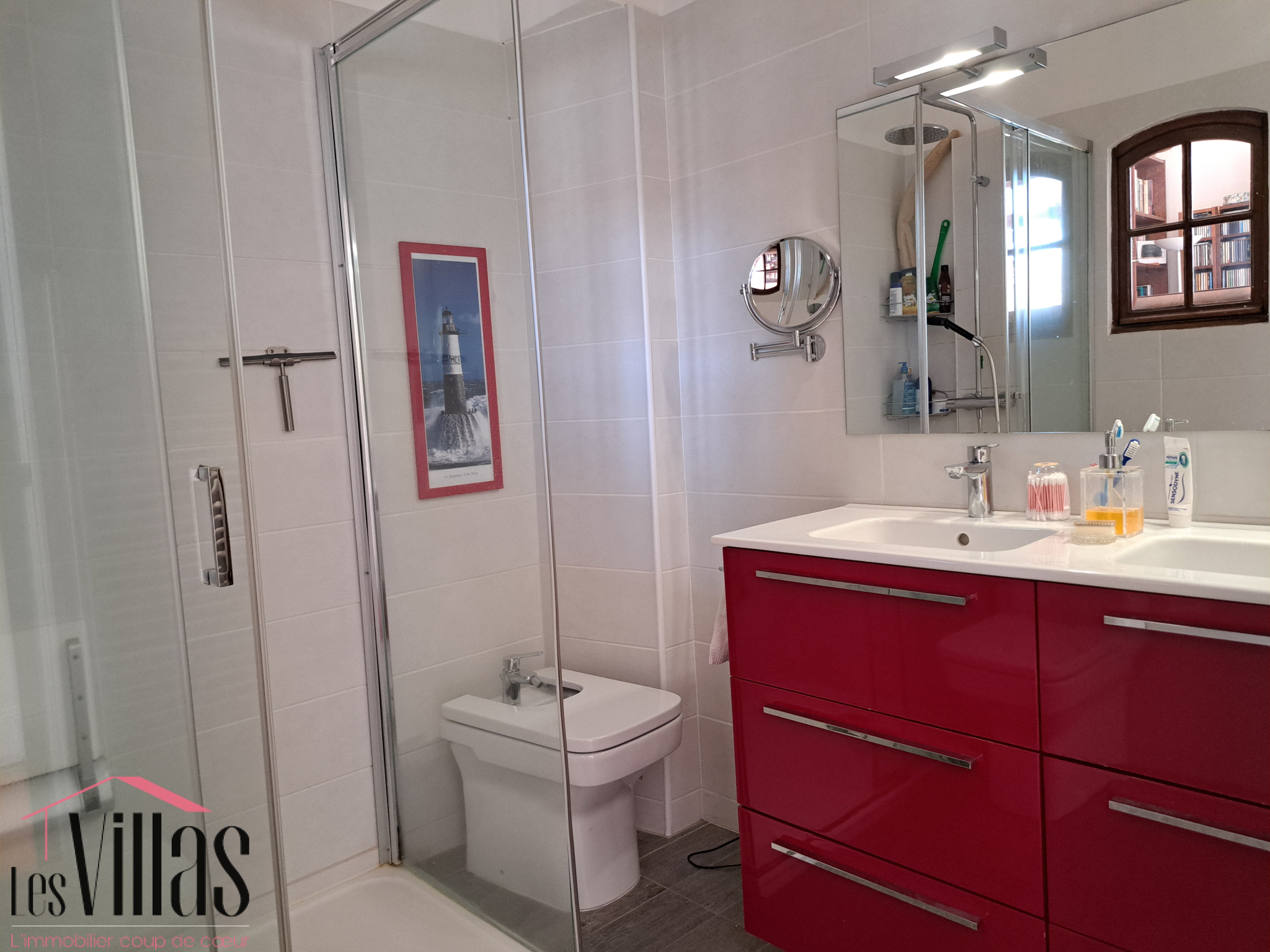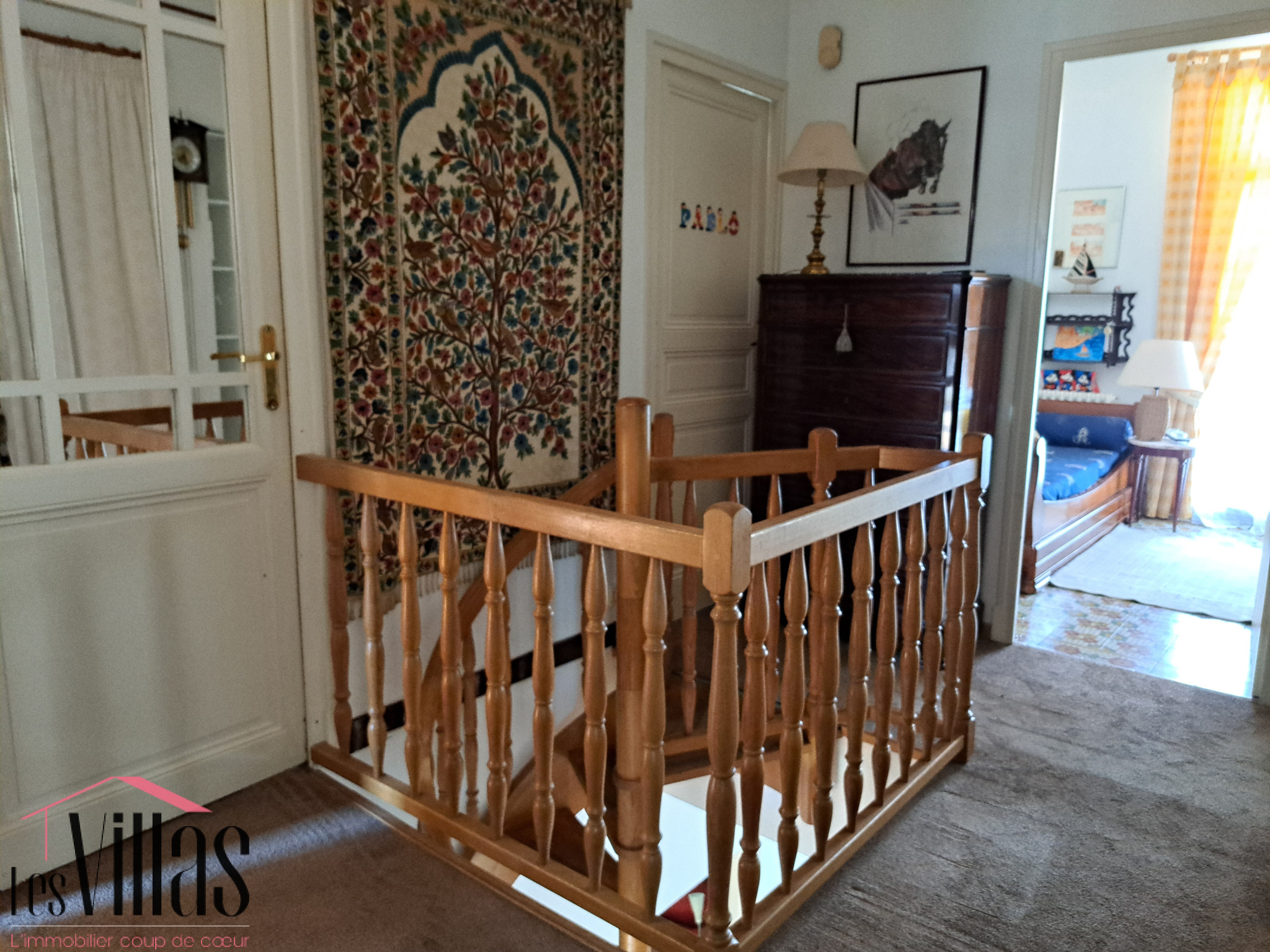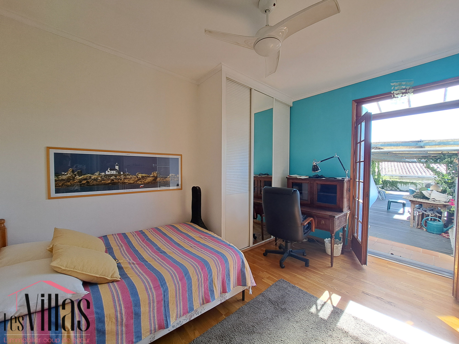 L’étage accueille quatre chambres spacieuses, dont une seconde suite avec salle d’eau privative et une salle de bain indépendante. L’une des chambres s’ouvre sur une grande terrasse de plus de 40 m2, idéale pour profiter du climat méditerranéen.