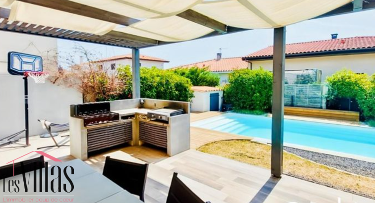 Les extérieurs réservent de beaux moments au bord de la piscine chauffée de 7.5 x 3.90 m (traitée au sel et filtre verre) ou pour des déjeuners sur la terrasse avec la cuisine d'été.