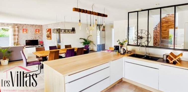 En RDC, la pièce de vie de 50 m2 est composée d'un grand salon- séjour donnant sur la grande terrasse, la piscine et la nature environnante. La cuisine ouverte entièrement équipée possède également un cellier attenant.